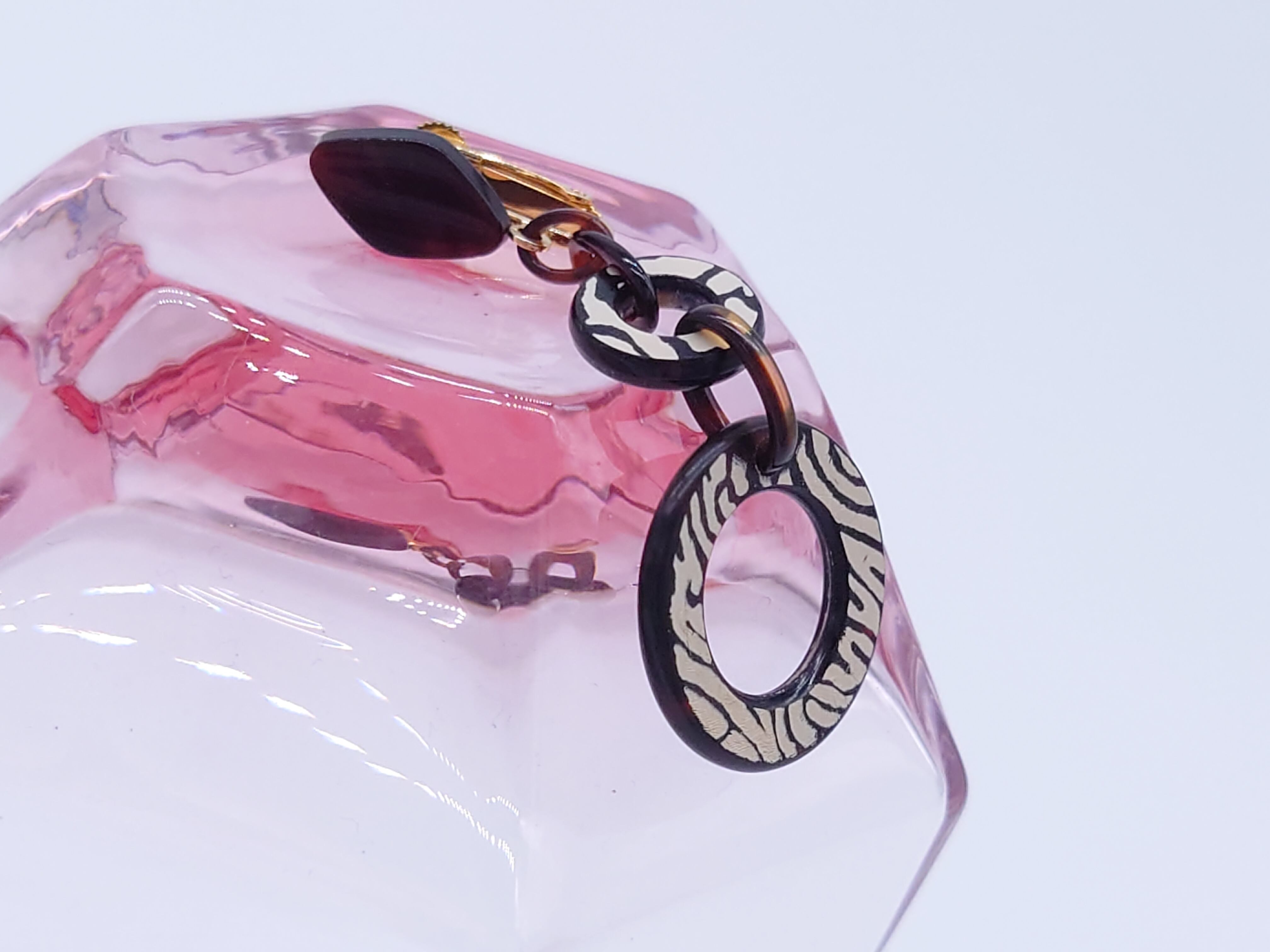 ●説明 本べっ甲 バラフ甲(背甲)使用 漆水目甲(背甲)使用 金具 金メッキばね式使用 非常に存在感のある大き目ぶら下がりタイプのイヤリング。今では貴重な本水目をイメージした柄に漆塗りを使用ししっかりと作りこみました!このパーツは長崎の老舗の職人さんの作品で、この味わいはこの方にしか出せません!是非とも手作りの温かみや手触り、着け心地を実感して欲しいイヤリングです!大きさの割にべっ甲はとても軽いため重さを感じず疲れにくいです。ゼブラ柄(水目柄)はどのようなお洋服にも合わせやすく便利アイテムです。形違いにE-087のイヤリングもございますので是非ご覧になって下さい!