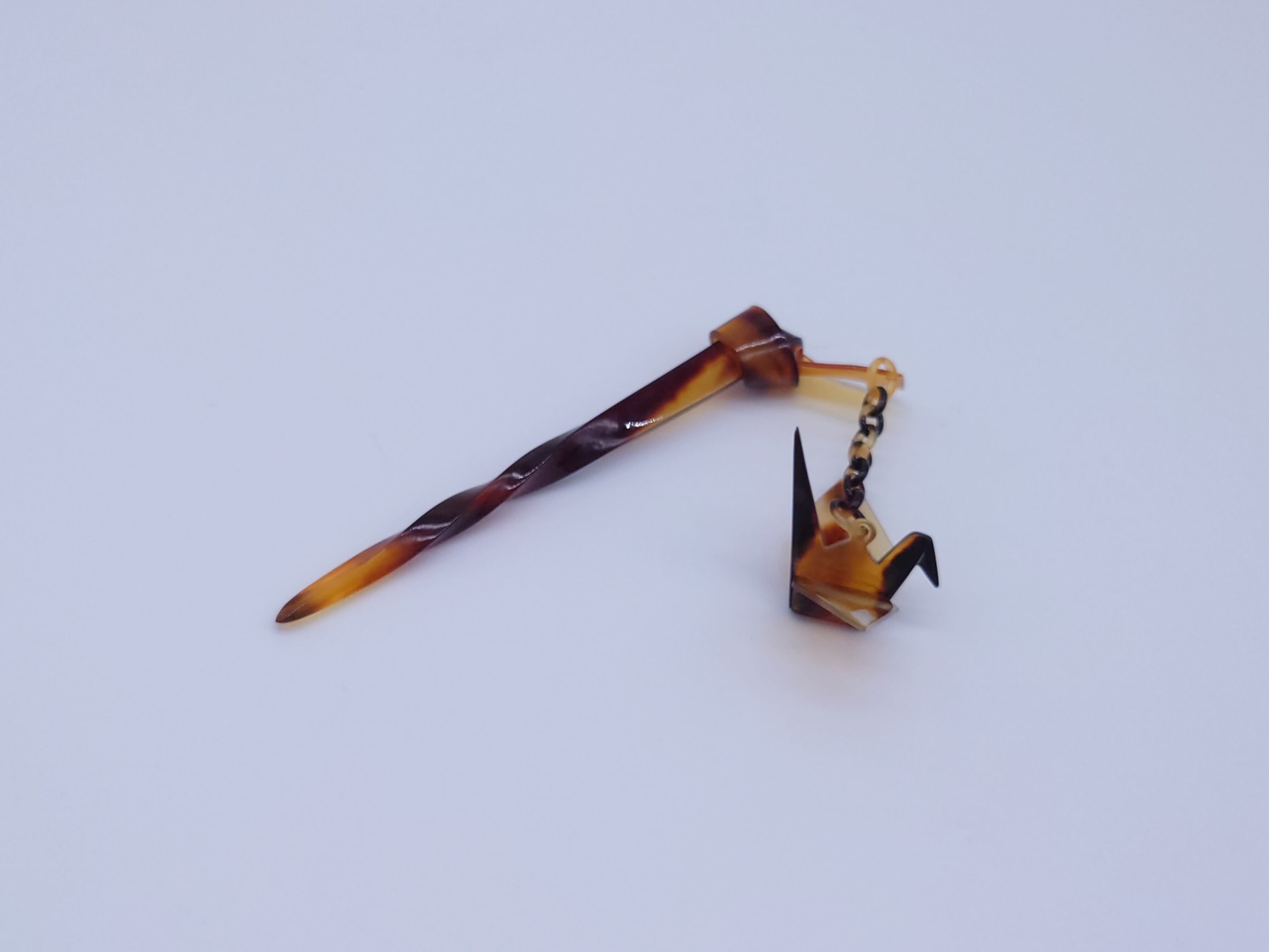 ●サイズ 長さ約13cm 鶴サイズ約6.5cm ●説明 本べっ甲 バラフ(背甲)使用 一本足の簪に折り鶴をぶら下げた遊び心のある一品です。日本の文化を粋に表現した職人さんの作品です。一本足部分も粋にねじり込んだお洒落で技の光る簪!中々見ないデザインですのでこの機会に是非手に入れて頂きたい商品となっております。お値段もリーズナブルに設定しています。遊び心のある簪をぜひ!商品はこちらの梱包にて大切に発送致します。天然素材の為、色目やサイズ感は多少異なる場合がございます。※べっ甲及び琥珀等の天然素材はすべて本物です。