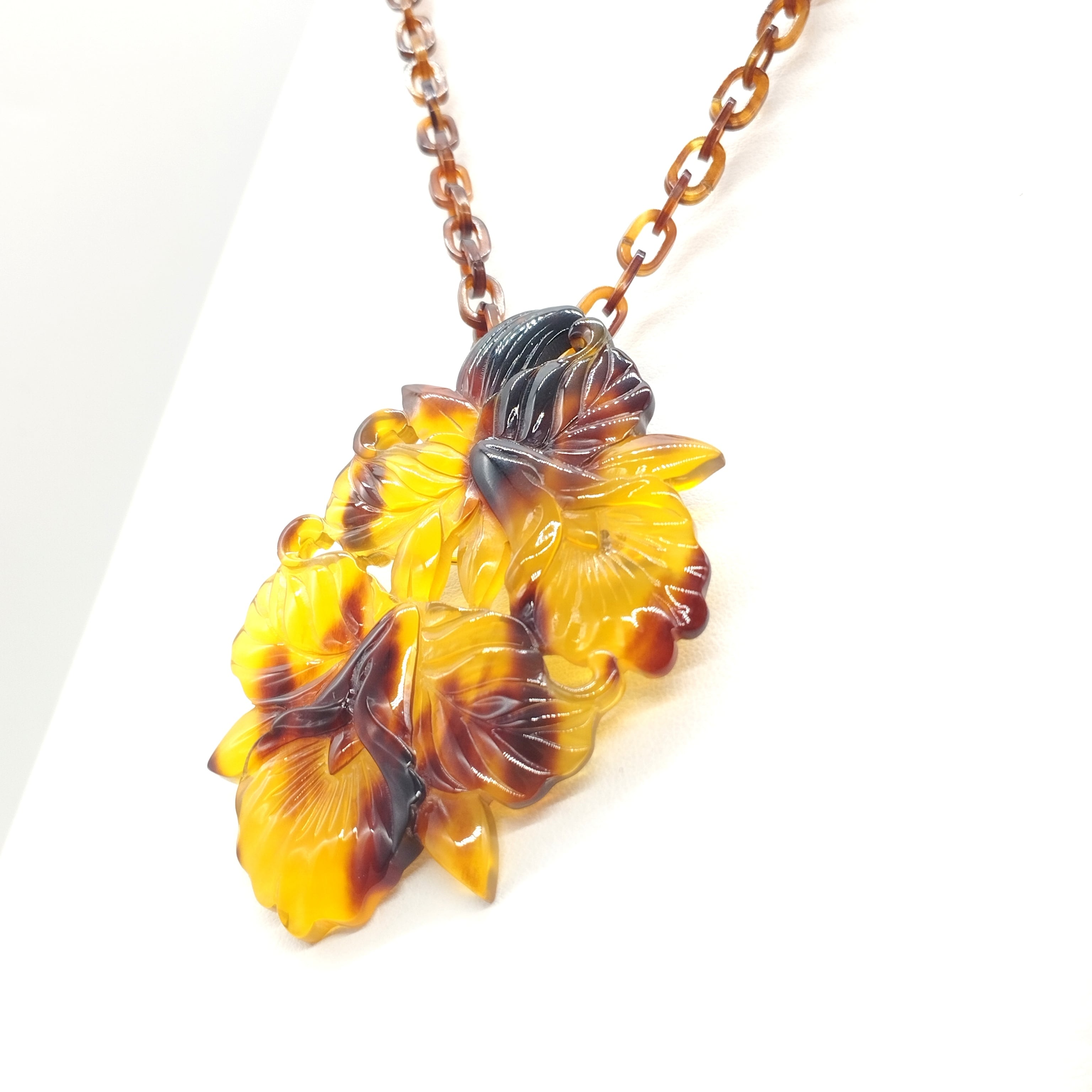 上茨布を使用し、熟練した職人さんによって、繊細に彫られた花彫りが美しく上品なペンダントブローチです。上茨布は特上茨布の次に美しく、贅沢な色味とツヤが特徴です。是非手にとって感じていただきたい。丁寧に手作業で造られた鼈甲細工(花彫り)は、一つとして同じ物はなく、心まで豊かにしてくれる温かさがあります。大切に使い続ける事ができる素敵な一品です。2way仕様でペンダントとしてもブローチとしてもご使用いただけますので、是非この機会に長くご愛用下さい。