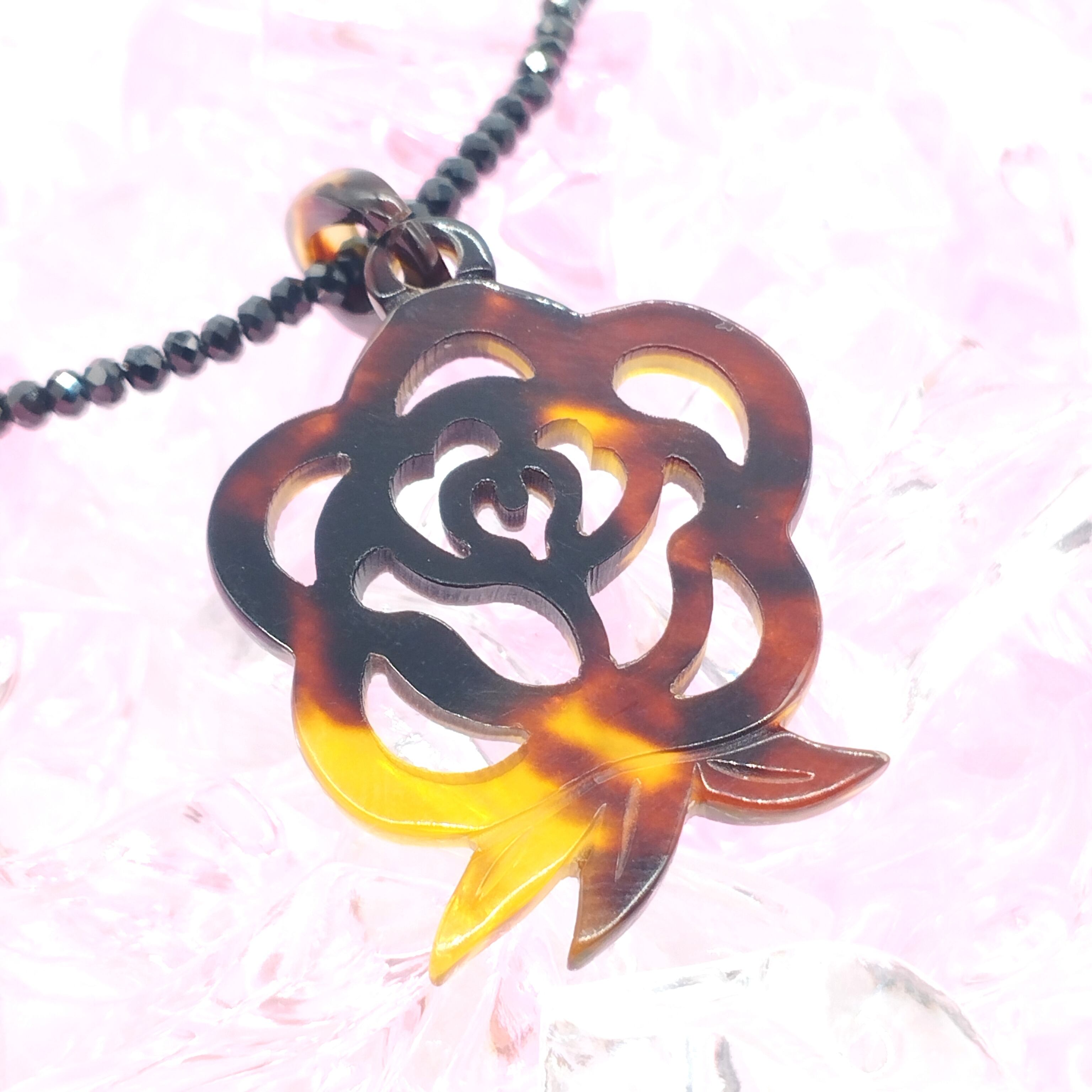 お求めやすいスピネルチェーン付きの薔薇モチーフ透かし彫りペンダントトップです。べっ甲特有の色合いを活かし職人技で丁寧に透かし彫りした一品です。最初のべっ甲アクセサリーはこの商品で是非べっ甲アクセサリーデビューしてみませんか?