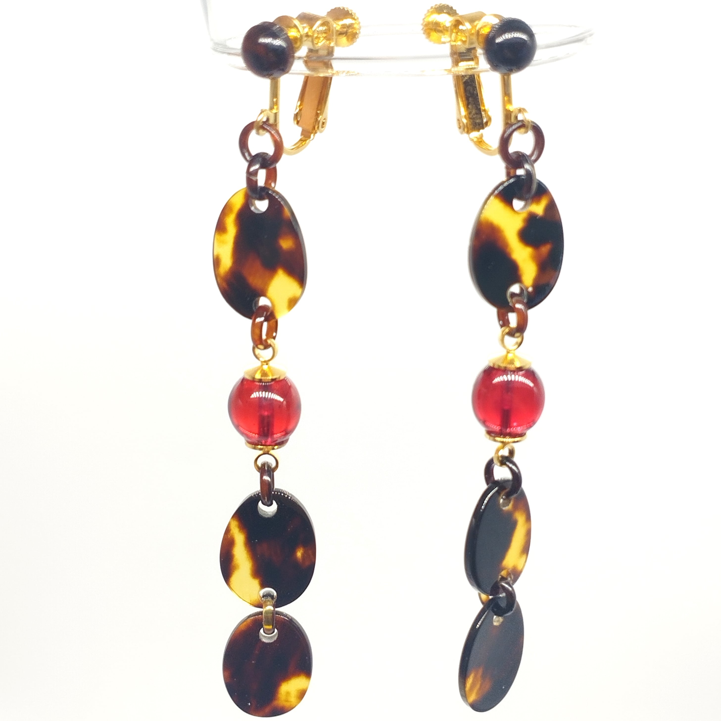 小ぶりなべっ甲の間に印象的な本琥珀(レッドアンバー)をあしらったぶら下がりイヤリングです。4連に連なったパーツが耳元からぶら下がりゆらゆらと揺れる姿は注目度抜群です。