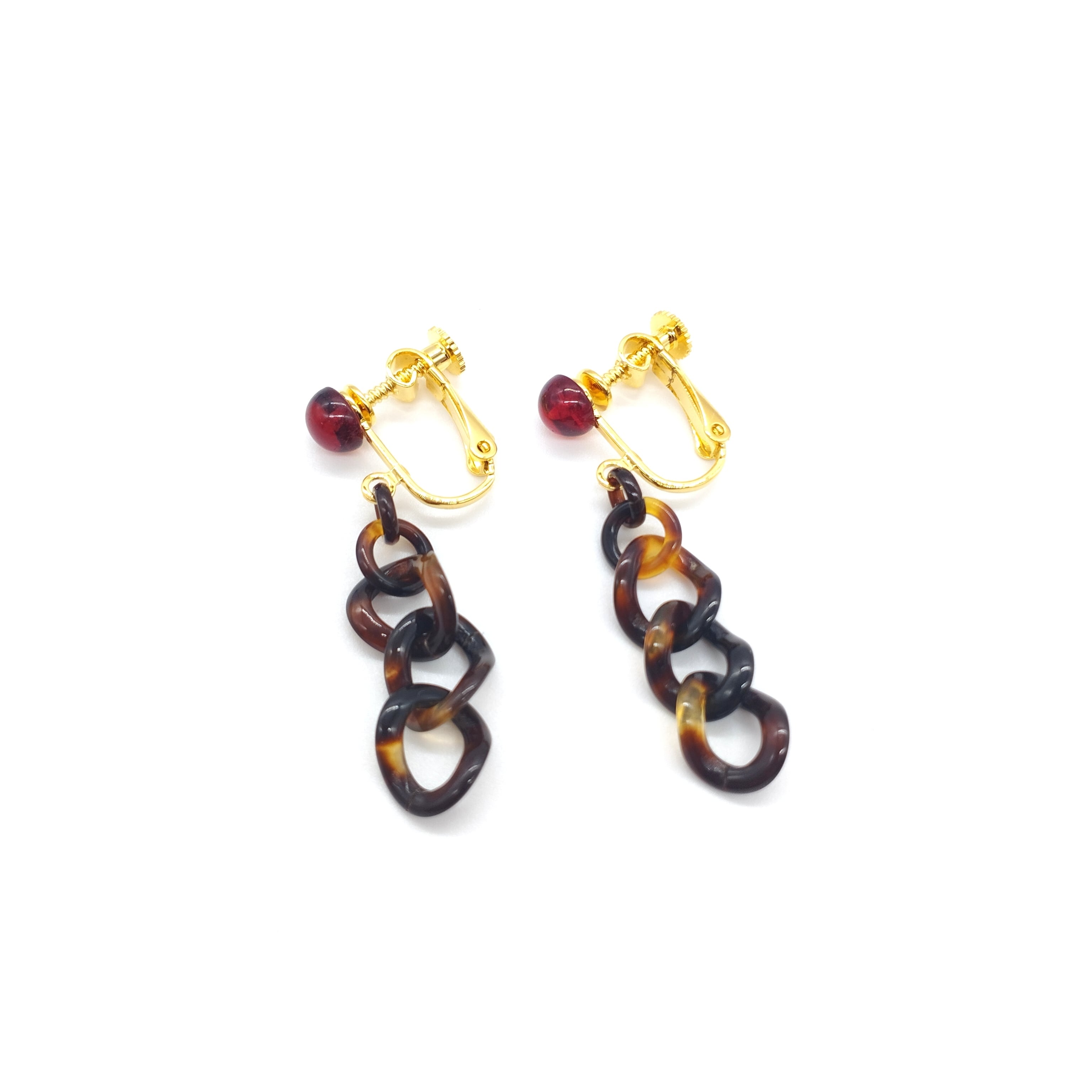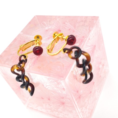 耳元には本琥珀(レッドアンバー)が、そこから連なるべっ甲喜平パーツの可愛いイヤリングです。ワンポイントの赤が印象的でゆらゆらと揺れるべっ甲喜平パーツとの相性が良く、よりカジュアル感を演出してくれます。日常のお出かけに是非お使いください。