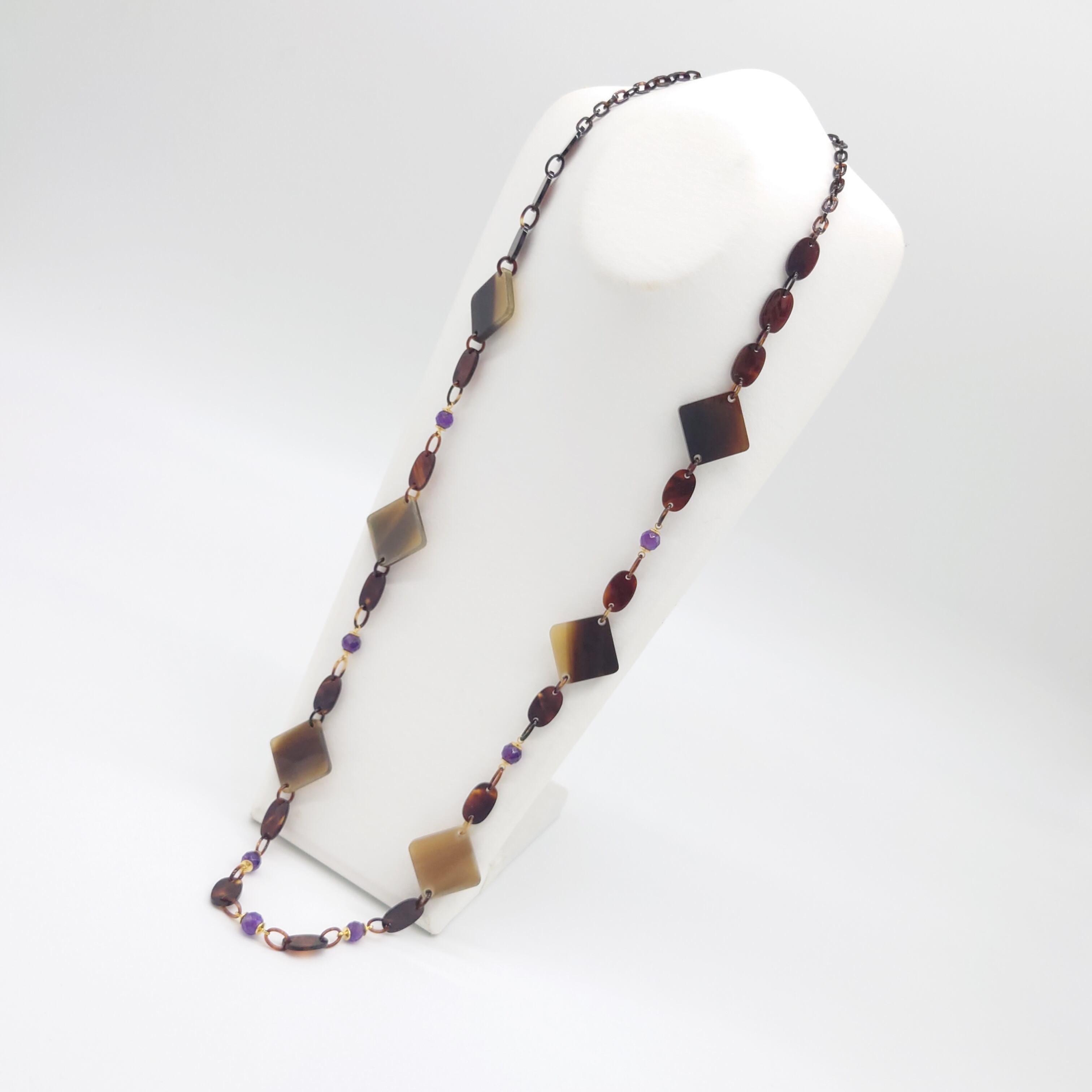 ●サイズ 全長約90cm ●説明 本べっ甲 バラフ(背甲)使用 バッファロー使用(菱パーツ) アメシスト(カット玉)使用 留め具メッキカギ使用 90センチのロングネックレスは胸元下まで延びアメシストの輝き、べっ甲、バッファローのオーガニックさを存分に見せつけてくれる商品です。エレガントなのに遊びの利いたロングネックレスはフォーマルな場所にもピッタリ!遊び心のある大人カッコイイネックレスを是非!商品はこちらの梱包にて大切に発送致します。天然素材の為、色目やサイズ感は多少異なる場合がございます。※べっ甲及び琥珀等の天然素材はすべて本物です。