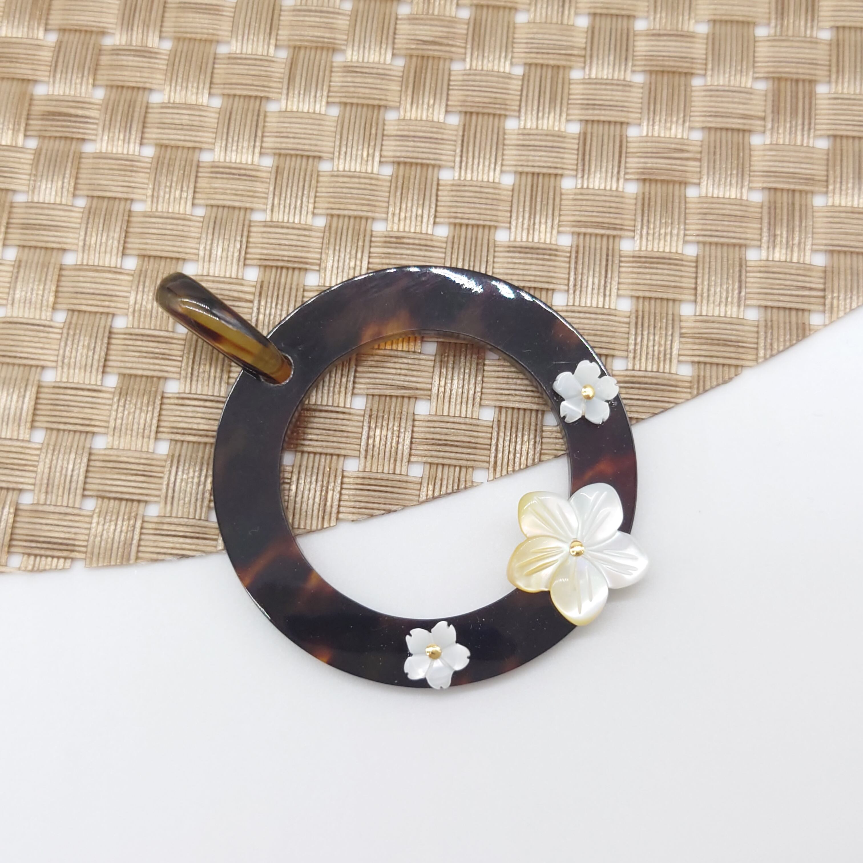 ●サイズ タテ約6.7cm×ヨコ約4.5cm(バチカン含む)※チェーンは別売りになります。 ●説明 本べっ甲 バラフ(背甲)使用 蝶貝(花モチーフ)使用 サークルタイプの少し大きめべっ甲に可愛らしい蝶貝をセンターに大き目を一個、両サイドに二個を施したペンダント。どちらかというとカジュアル向きですがフォーマルでも上品さがあるため、ご使用可能な万能アイテム!大人かわいいを肌で感じてほしいペンダント。サークルタイプですので色々なお洋服にも合わせやすくなっています。この価格でのべっ甲はリーズナブルに提供させていただいてますのでこの機会に是非ご購入下さい。親子でのシェアもよろしいかと思います。商品はこちらの梱包にて大切に発送致します。天然素材の為、色目やサイズ感は多少異なる場合がございます。※べっ甲及び琥珀等の天然素材はすべて本物です。商品はこちらの梱包にて大切に発送致します。天然素材の為、色目やサイズ感は多少異なる場合がございます。※べっ甲及び琥珀等の天然素材はすべて本物です。