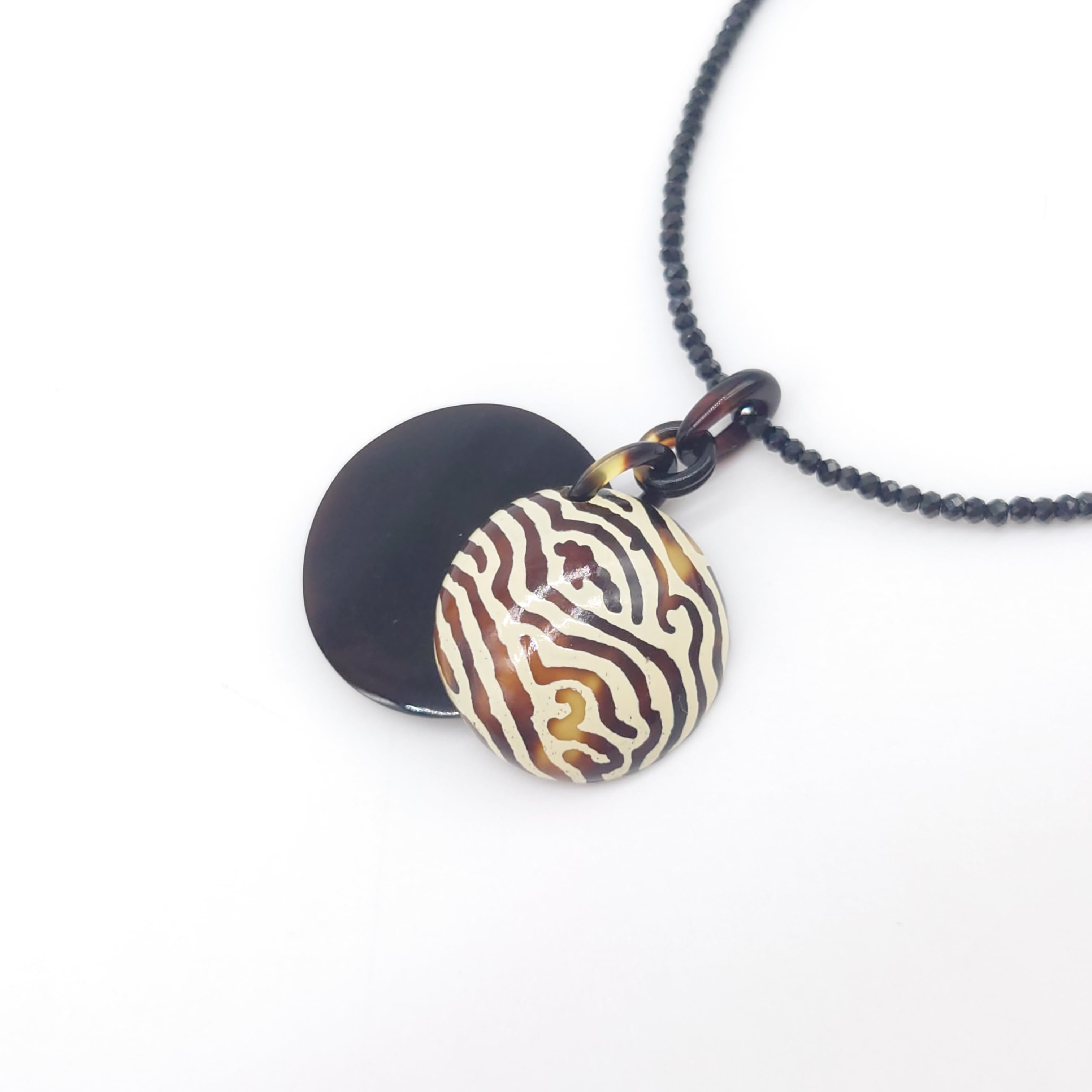 ●サイズ タテ約5cm×ヨコ約2.8cm(バチカン含む) ※チェーンは別売りになります。●説明 本べっ甲 黒甲(背甲)使用 水目柄(漆塗り)使用 二枚重ねのユラユラと揺れるモダン可愛いペンダント。水目パーツの裏にはべっ甲柄、水目柄が目立つように白漆を塗っております。黒丸べっ甲パーツはリバーシブルにも使える様に裏面の角を落として丸みを出しています。オーガニックなべっ甲モダンを楽しんで頂けます。Tシャツなどのカジュアルスタイルにもピッタリ!秋から冬のニットセーターにも柔らかさが感じられ素敵です。親子でシェアもお得で仲良し!是非この機会に購入してください。商品はこちらの梱包にて大切に発送致します。天然素材の為、色目やサイズ感は多少異なる場合がございます。※べっ甲及び琥珀等の天然素材はすべて本物です。
