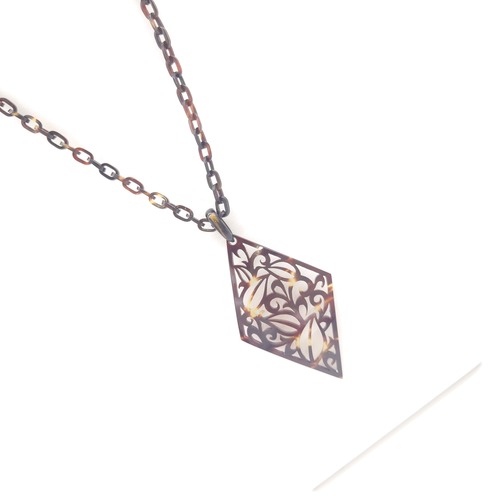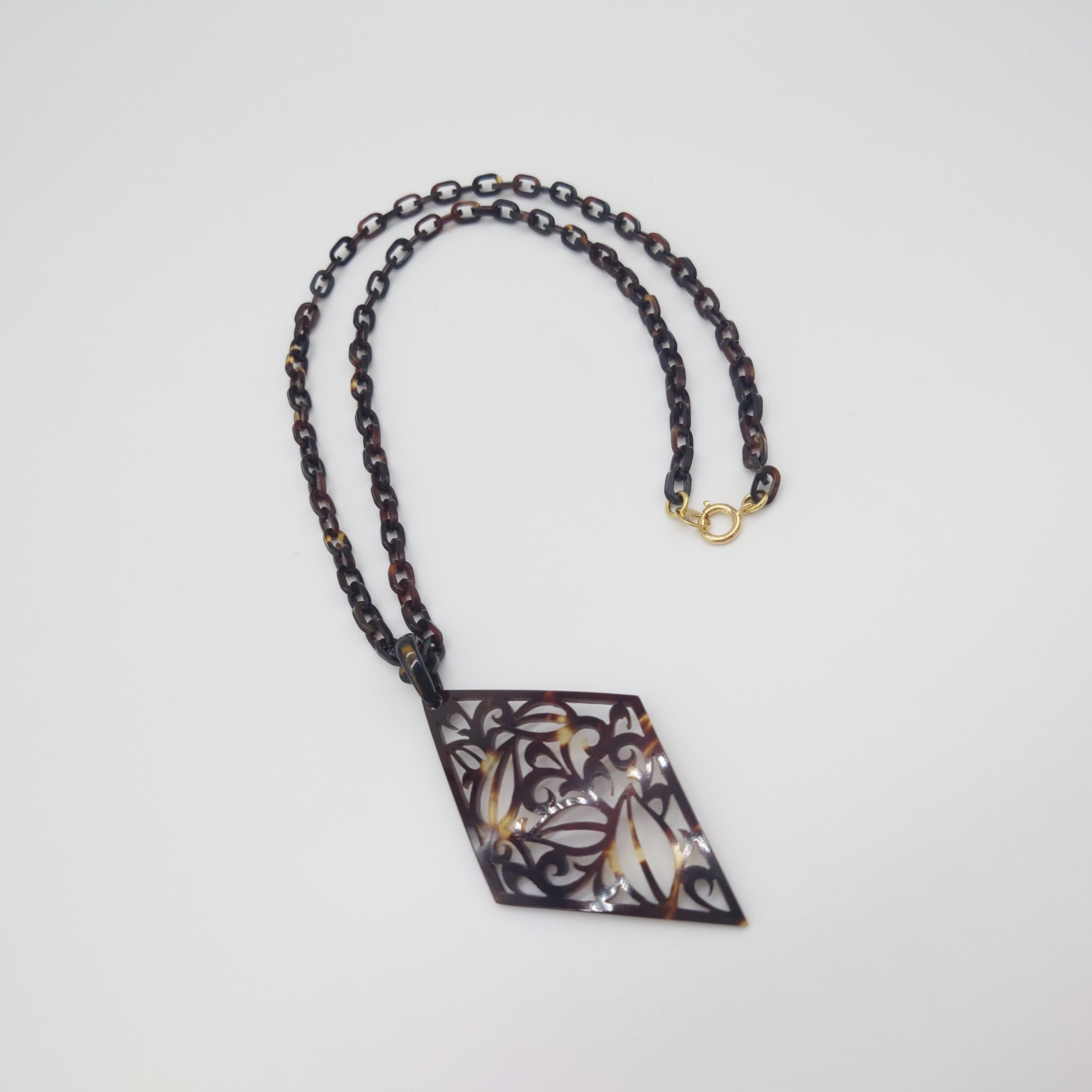 ●サイズ タテ約9cm×ヨコ約4.5cm(バチカン含む)※チェーンは別売りになります。 ●説明 本べっ甲 バラフ(背甲)使用 ひし形プレート全面透かし彫り。画像を見て頂ければわかりますが、とても繊細な匠の技が光る一品です。デザインは唐草、リーフの透かしを上手くお洒落に組み合わせた今っぽい、かっこかわいい感じに仕上げたペンダント。当ショップでのイチオシのペンダントデザインですので自信を持ってお届けします!職人さんの思いとべっ甲の良さを感じて頂きたい一品!大切な方へのプレゼントにも最適です。ギフト梱包もオプションにて提供しておりますのでご利用下さい。商品はこちらの梱包にて大切に発送致します。天然素材の為、色目やサイズ感は多少異なる場合がございます。※べっ甲及び琥珀等の天然素材はすべて本物です。