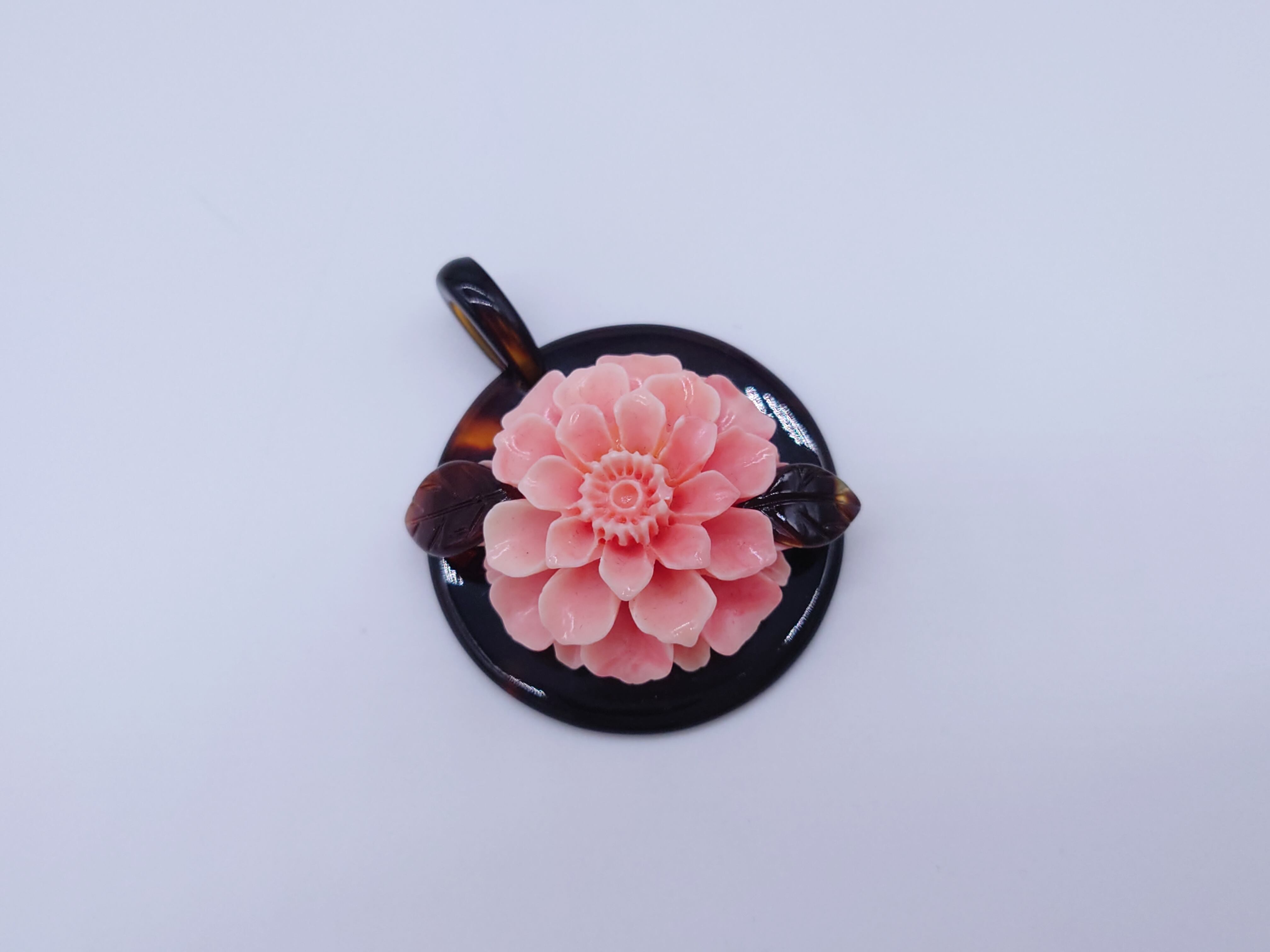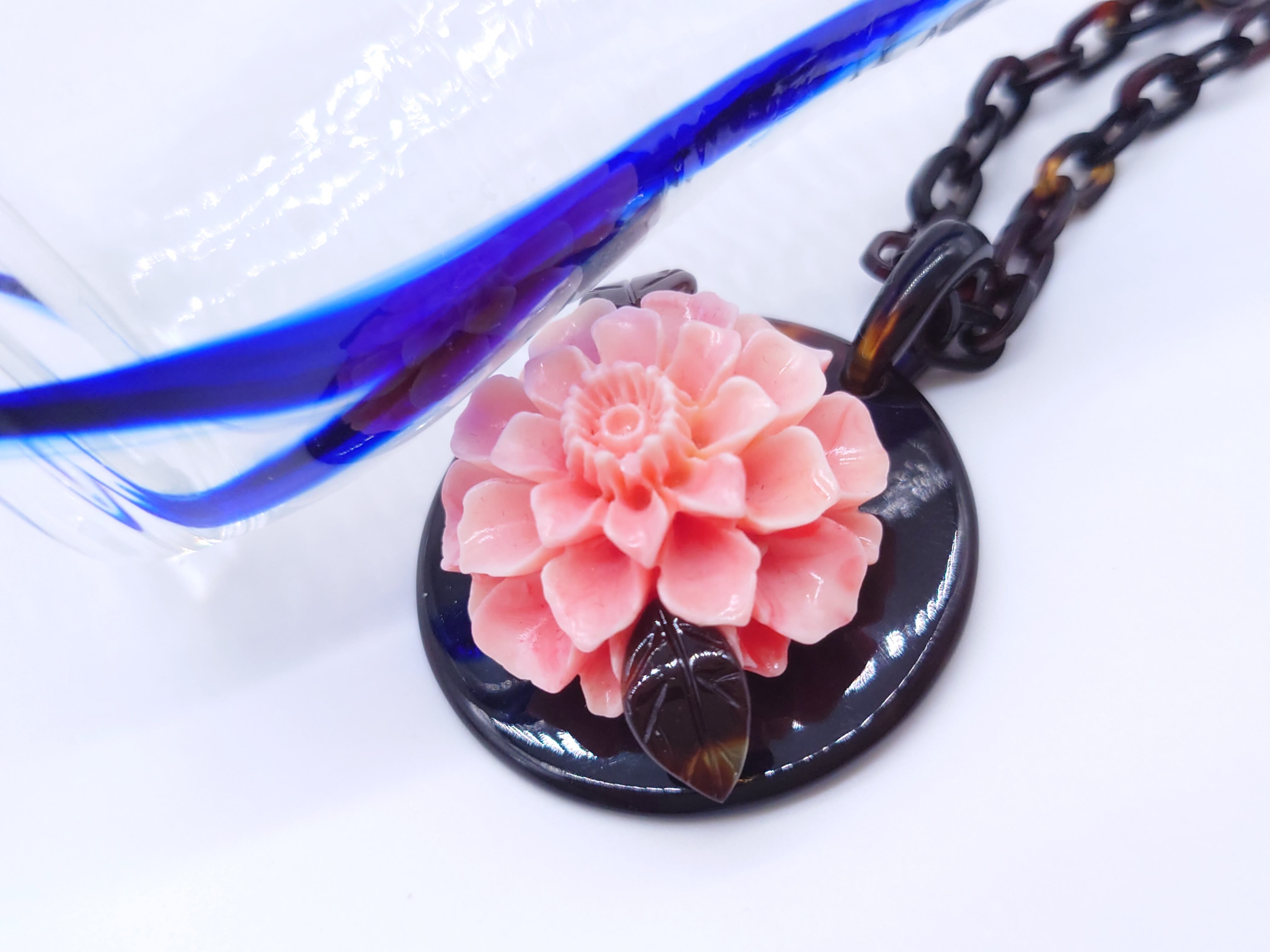 ●サイズ タテ約4.3cm×ヨコ約4.3cm(バチカン含まず) ●説明 本べっ甲 バラフ(背甲)使用 海竹珊瑚使用 ※チェーンは別売りになります。ダリアモチーフの海竹珊瑚をべっ甲土台に乗せた大き目な存在感のあるペンダントを作成しました。珊瑚のサイドには非常に繊細な作りのべっ甲花びらを取り付け素敵に演出。淡いピンクが貴女の装いに華を添えてくれる一品です。ボリュームのあるオーガニックな素材を胸元で楽しんで頂ける本物ペンダント!海竹珊瑚とは「トクサヤギ」ともよばれ象牙色の珊瑚を着色したものです。是非この機会に親子でシェアされても良いと思いますのでご購入頂きたい一品です。商品はこちらの梱包にて大切に発送致します。天然素材の為、色目やサイズ感は多少異なる場合がございます。※べっ甲及び琥珀等の天然素材はすべて本物です。