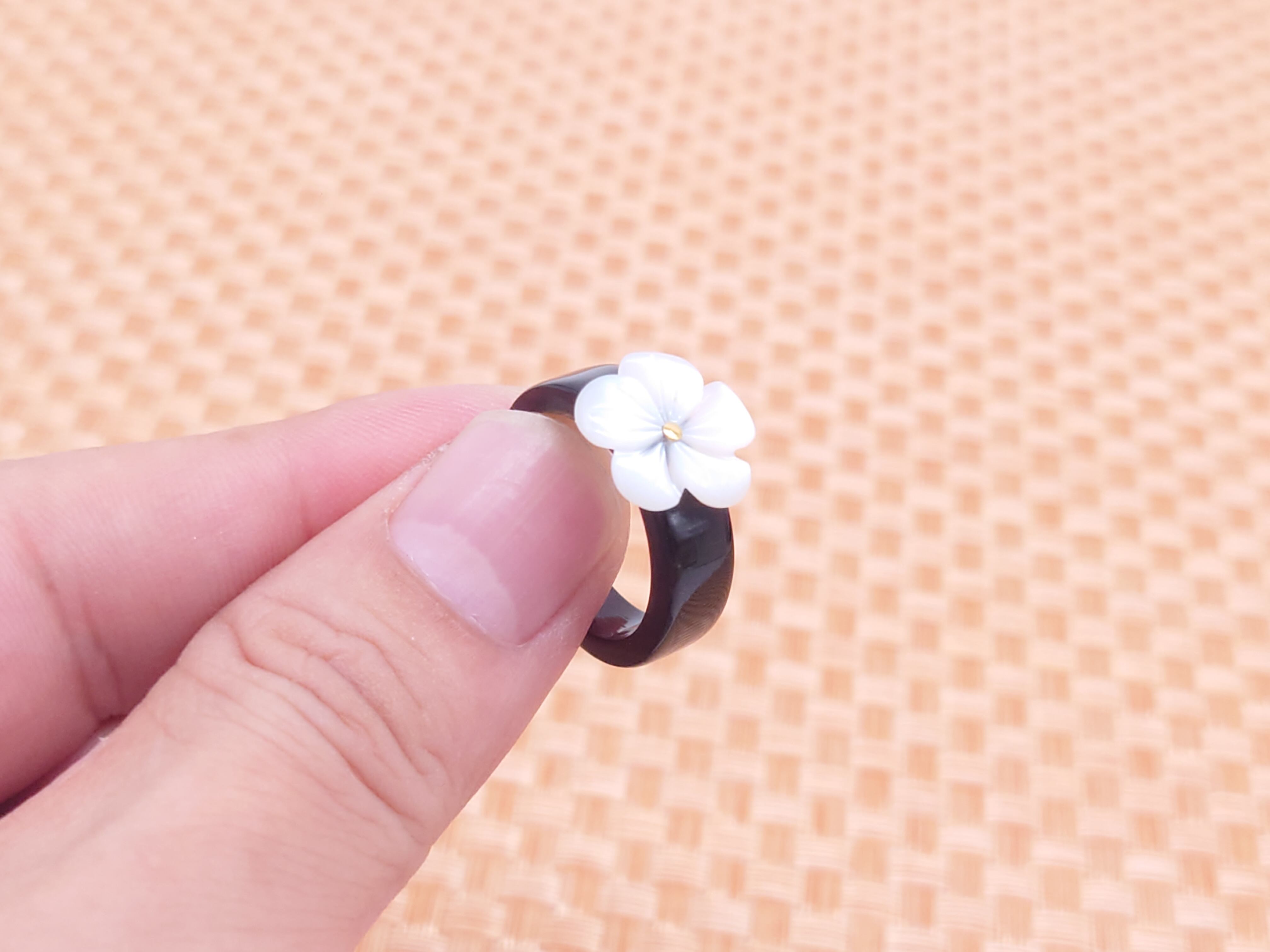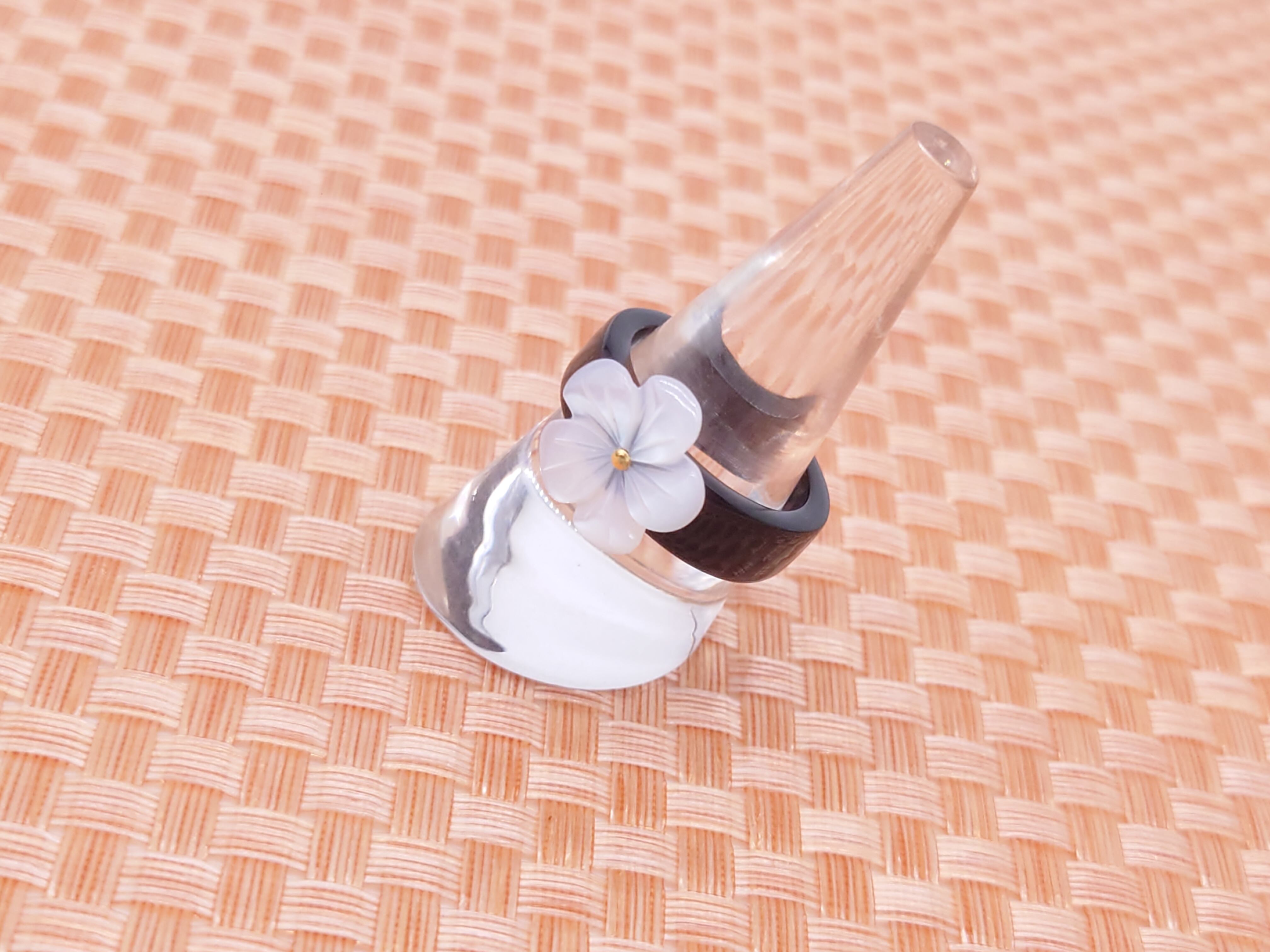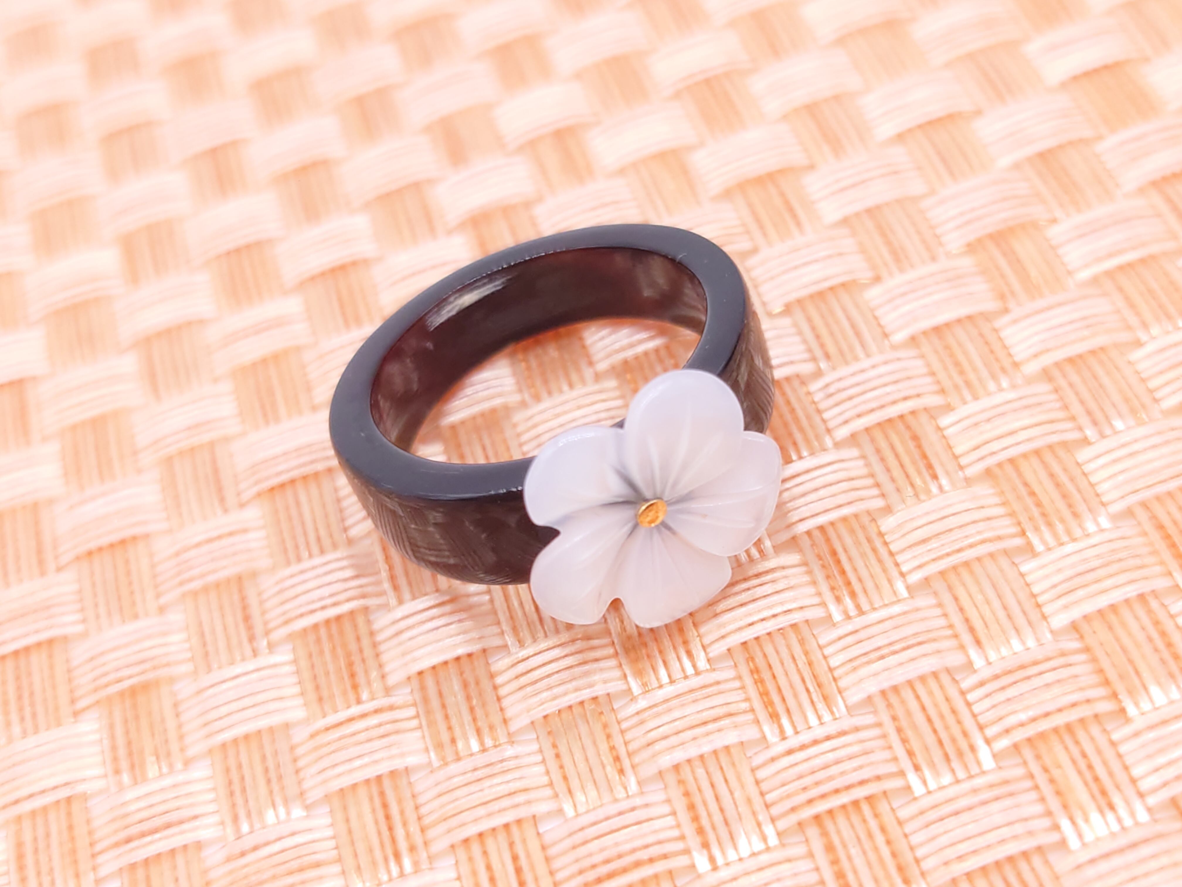 ●サイズ #14~#16(フリー)べっ甲幅約6ミリ●説明 本べっ甲 バラフ(背甲)使用 蝶貝(花モチーフ)使用 甲丸のべっ甲に可愛い白の蝶貝花を付けました。花の中心は真鍮のカシメで蝶貝花を固定してます。白蝶貝がどの角度からも華やかに目を引きます。べっ甲と蝶貝のオーガニックな素材とのコンビが大人の魅力を引き出します。カジュアルスタイルはもちろん、パーティーなどの華やかなシーンで活躍すること間違いなし!べっ甲は肌に良くなじむ為、着け心地バツグンです。親子でシェアされても素敵ですのでこの機会に是非。この機会にべっ甲の良さを存分に味わってください。商品はこちらの梱包にて大切に発送致します。天然素材の為、色目やサイズ感は多少異なる場合がございます。※べっ甲及び琥珀等の天然素材はすべて本物です。