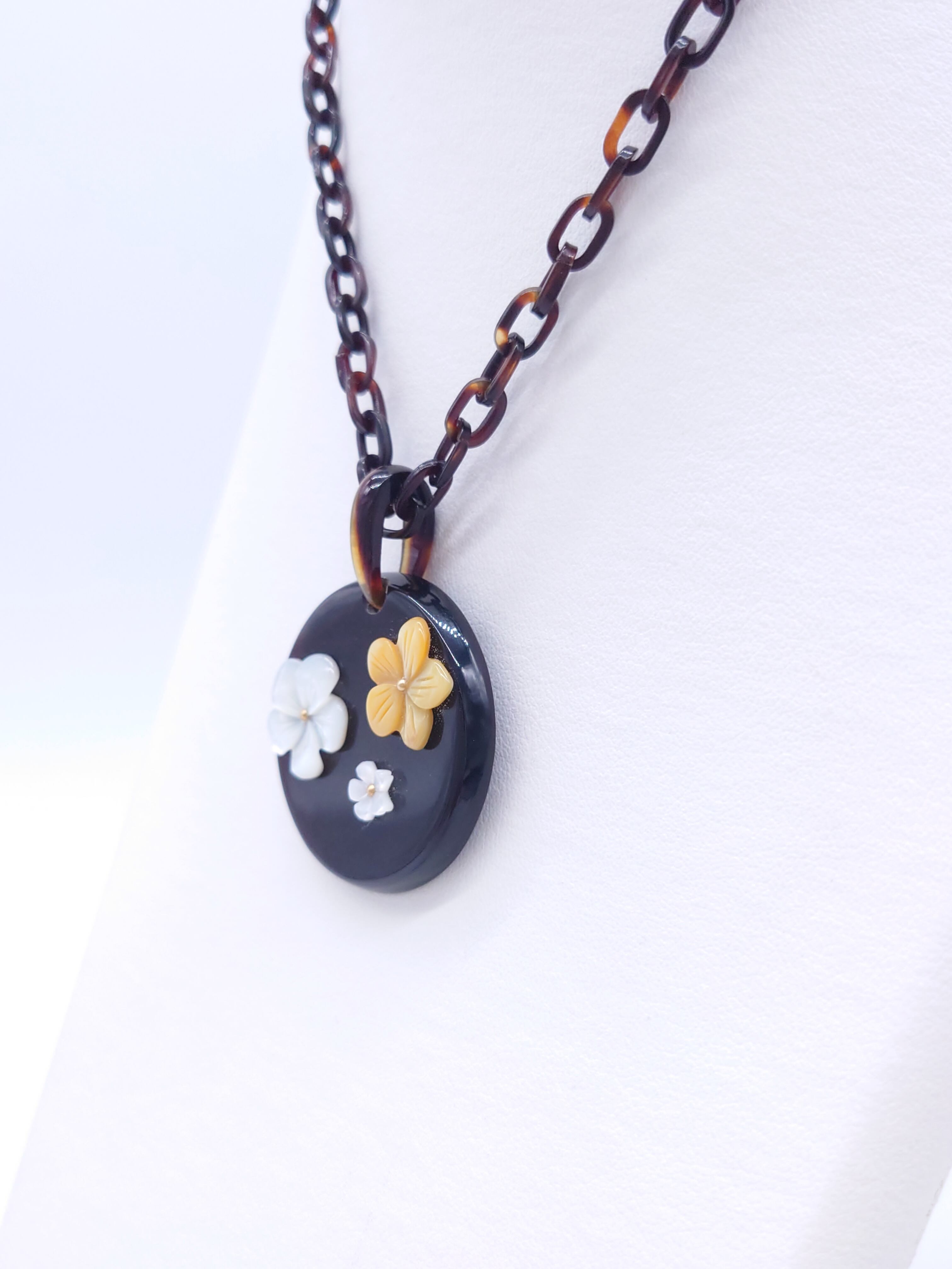 大き目サークルのべっ甲土台に蝶貝を3輪咲かせました!白蝶貝、黄蝶貝、と優しいカラーで華やかに!少し大き目なコイン型は存在感のあるペンダントに仕上がっています。明るく上品なペンダントは貴女の胸元をパッと照らして見る人の目を引くこと間違いなし!オーガニックな蝶貝とのコラボをお楽しみください。商品はこちらの梱包にて大切に発送致します。天然素材の為、色目やサイズ感は多少異なる場合がございます。※べっ甲及び琥珀等の天然素材はすべて本物です。