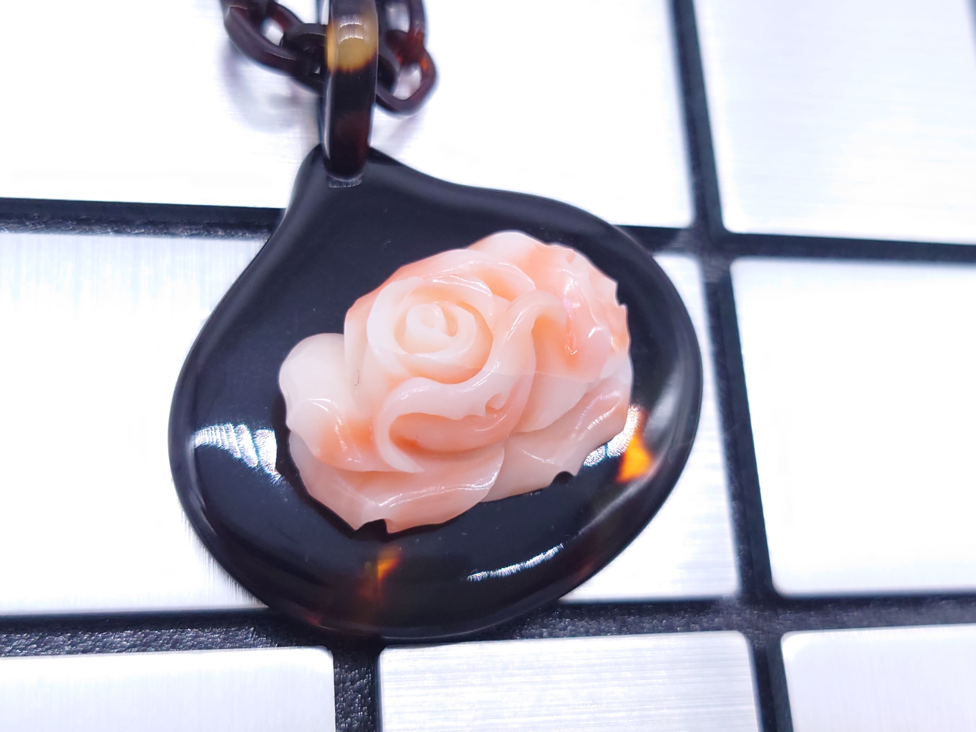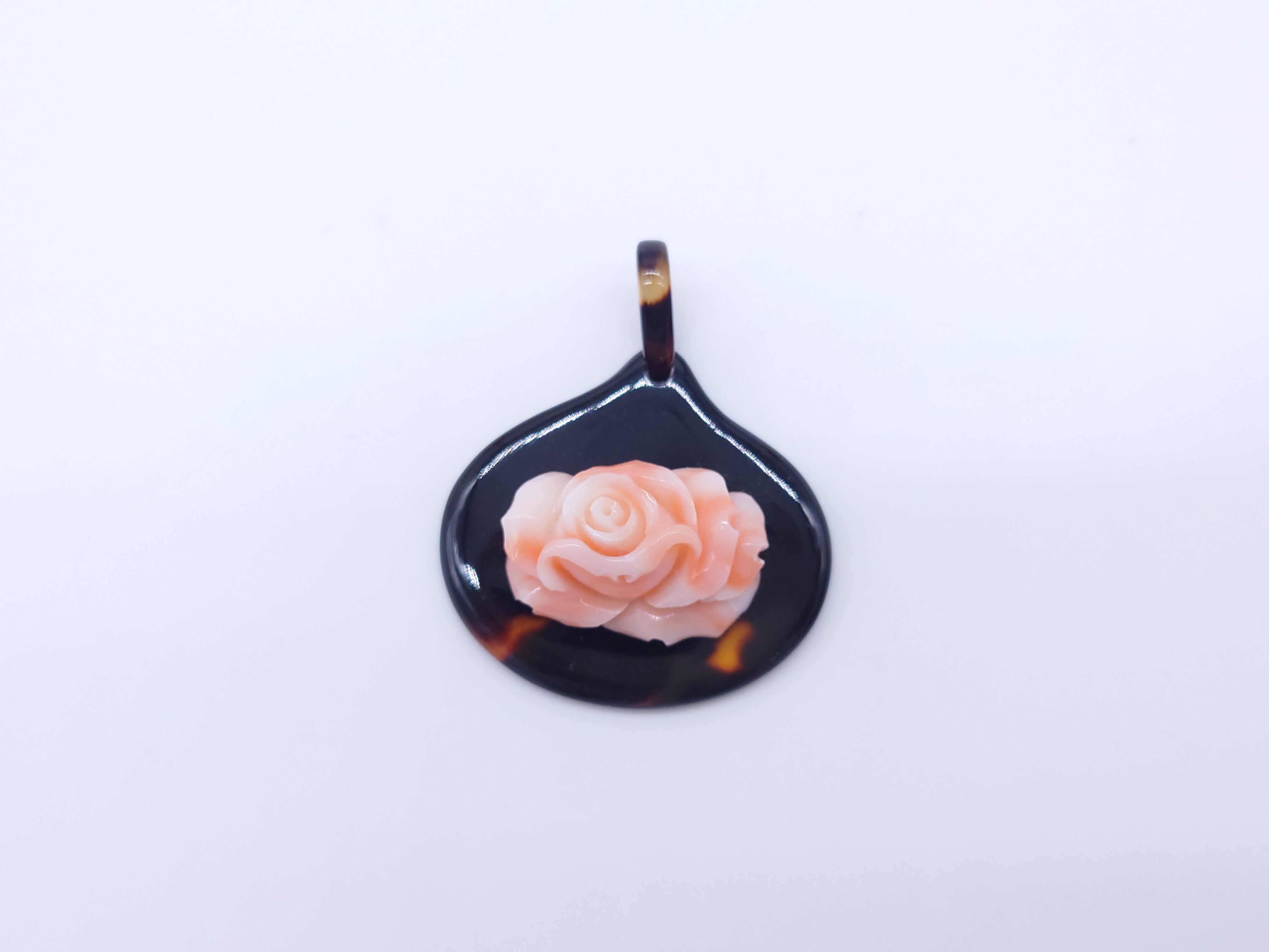 横長しずく形のべっ甲に丁寧に掘り込まれた珊瑚のバラ彫りを乗せた素敵なペンダント。べっ甲も希少ですが珊瑚も近年では大変希少になってきた物のコラボ。珊瑚の彫りは高知県の職人さんが丁寧に彫り上げました、純国産の一品です。値段もリーズナブルに設定していますのでこの機会に是非。リピートの効かない商品ですのでお早目にご購入ください。親御様へのプレゼントにも最適です。商品はこちらの梱包にて大切に発送致します。天然素材の為、色目やサイズ感は多少異なる場合がございます。※べっ甲及び琥珀等の天然素材はすべて本物です。