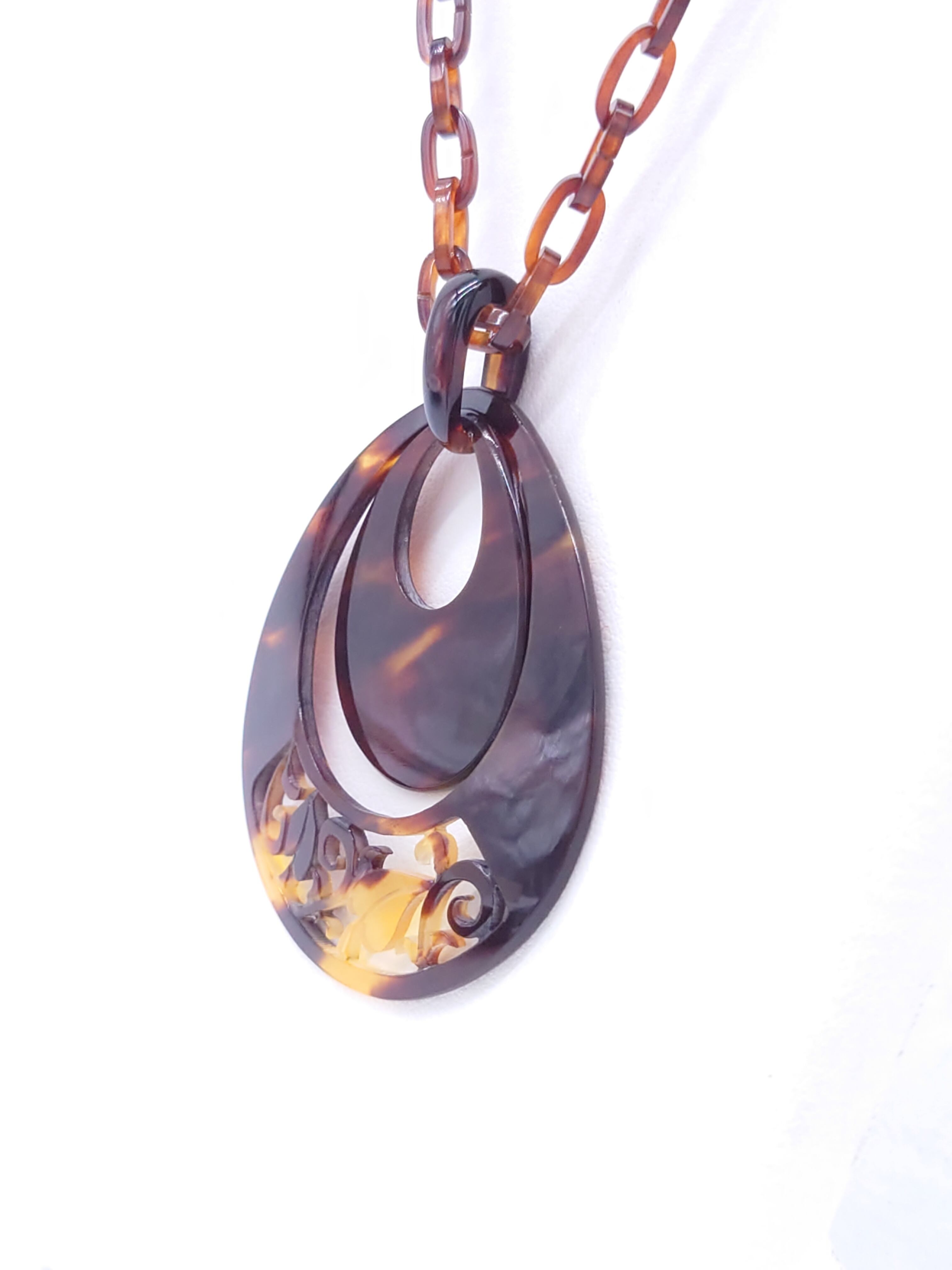 べっ甲チェーンとセットになったお得なペンダント。しずく型タイプのべっ甲に沢山の透かし彫りを施した職人さんの技と根気が光るペンダント!画像でもお分かりになるように全て手作りのオンリーワンな一品です。透かしのデザインもリーフと唐草のコンビで大人カワイイお洒落な図柄で描き上げました!葉っぱを2枚描き入れてより優しい雰囲気を演出出来ました!2連タイプで胸元でユラユラと揺れてお洒落なペンダント。年齢層も問いませんので親子でシェアされても素敵ですね。個人的に凄くオーガニックな雰囲気が出ているイチオシの商品だと思います。この価格でこのボリュームはお得ですので是非!またこちらの商品はYouTube動画でも配信していますので「なにわべっ甲プラージュ」で検索してみてください。商品はこちらの梱包にて大切に発送致します。天然素材の為、色目やサイズ感は多少異なる場合がございます。※べっ甲及び琥珀等の天然素材はすべて本物です。