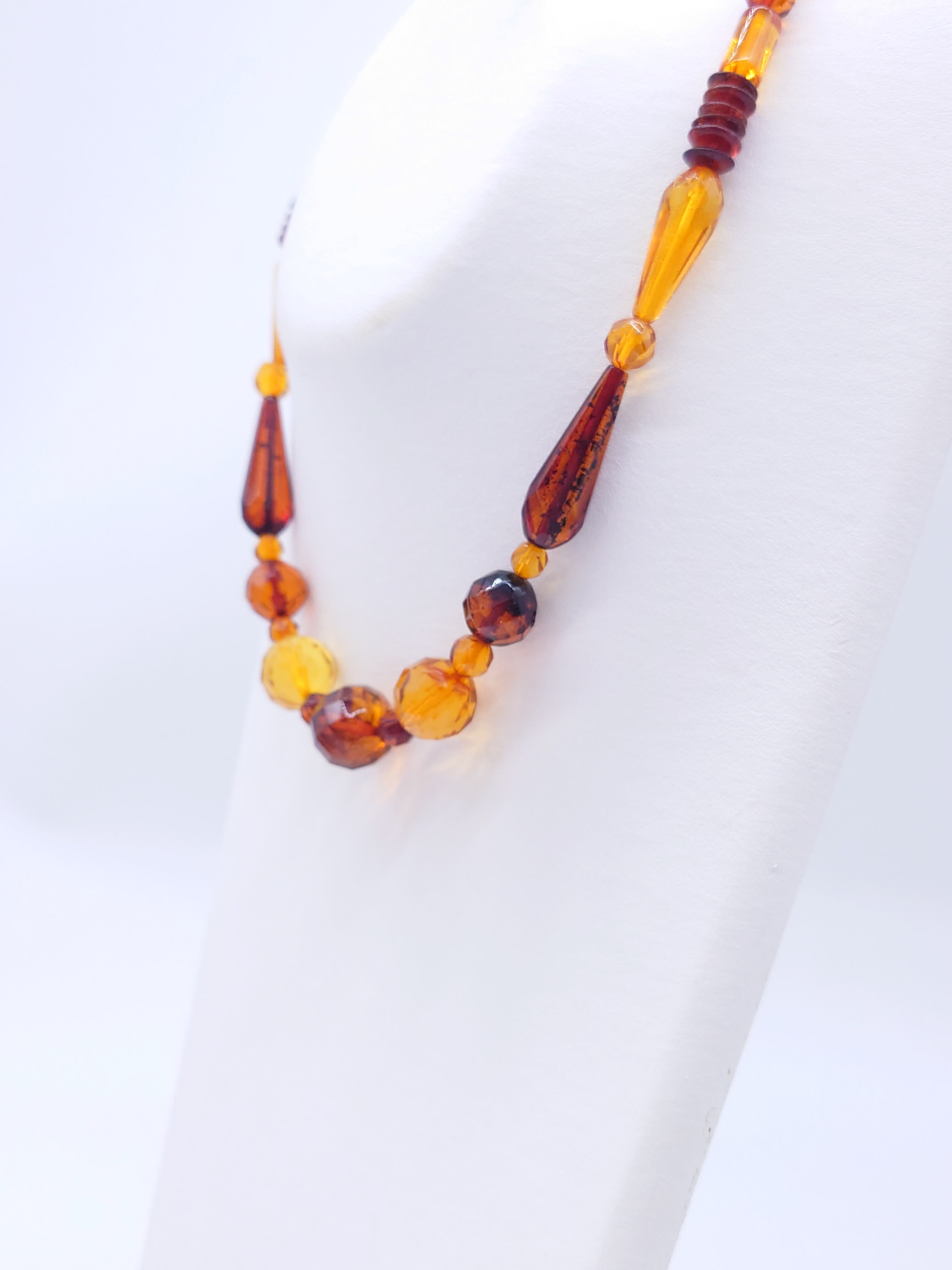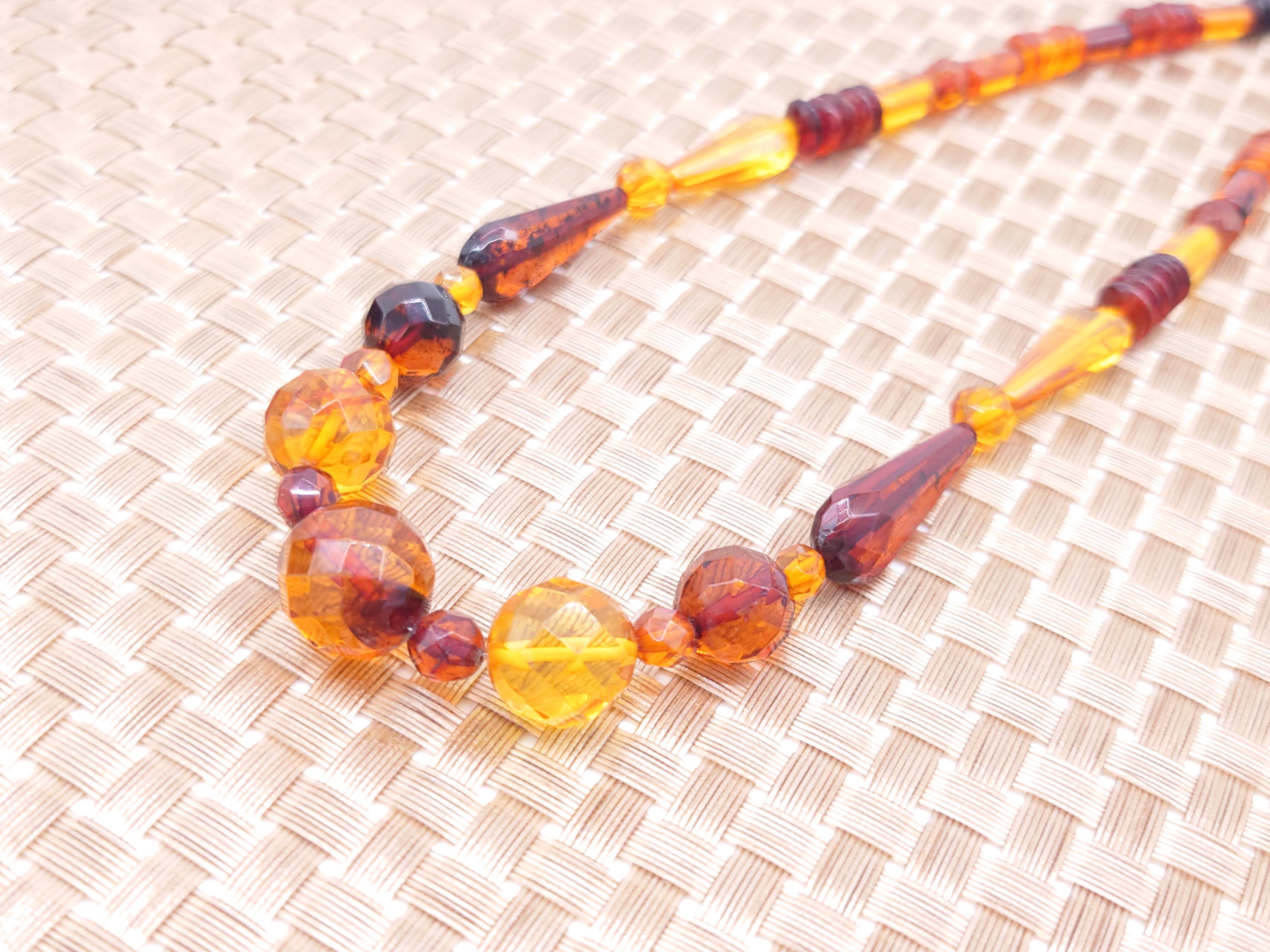 コニャックカラー、レモンカラーコンビ 丸玉はファセットカット仕上げ 円錐形琥珀は多面カット ボリュームは結構あり、中ぶり程度のサイズ感 色目は割とシックでリトアニア産な感じが出ているネックレスです。落ち着いた色目はフォーマルな場所で発揮しそうです。こちらの商品は特別価格にて販売していますので一点のみの売り切り商品です。それ以外の特別価格での琥珀ネックレスは N-150 N-151 の3点限定セールです。商品はこちらの梱包にて大切に発送致します。天然素材の為、色目やサイズ感は多少異なる場合がございます。※べっ甲及び琥珀等の天然素材はすべて本物です。