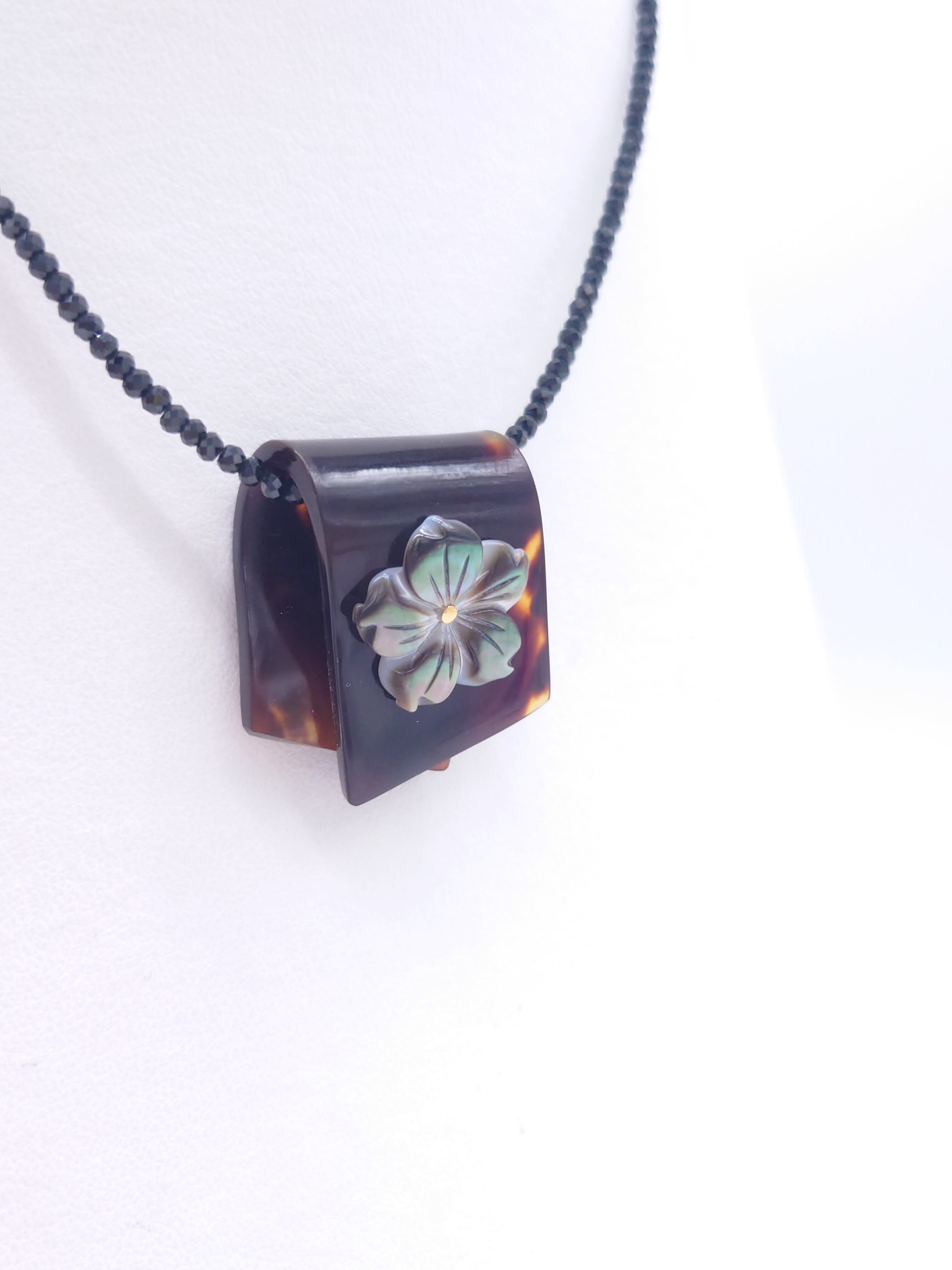 スピネルチェーンとセットになったお得なペンダント。べっ甲のプレートをクルリと曲げ込みチェーンが通るようにした折り曲げペントップ。そこにカワイイ蝶貝花を取り付けた大人可愛いお洒落なペンダントに仕上げました!カジュアル、フォーマルどちらにも相性が良く場所も選びませんのでお友達とのご旅行などにも一緒に連れていってあげてください!べっ甲と蝶貝の天然素材のコラボ。是非この機会に本物の良さを味わってください。商品はこちらの梱包にて大切に発送致します。天然素材の為、色目やサイズ感は多少異なる場合がございます。※べっ甲及び琥珀等の天然素材はすべて本物です。