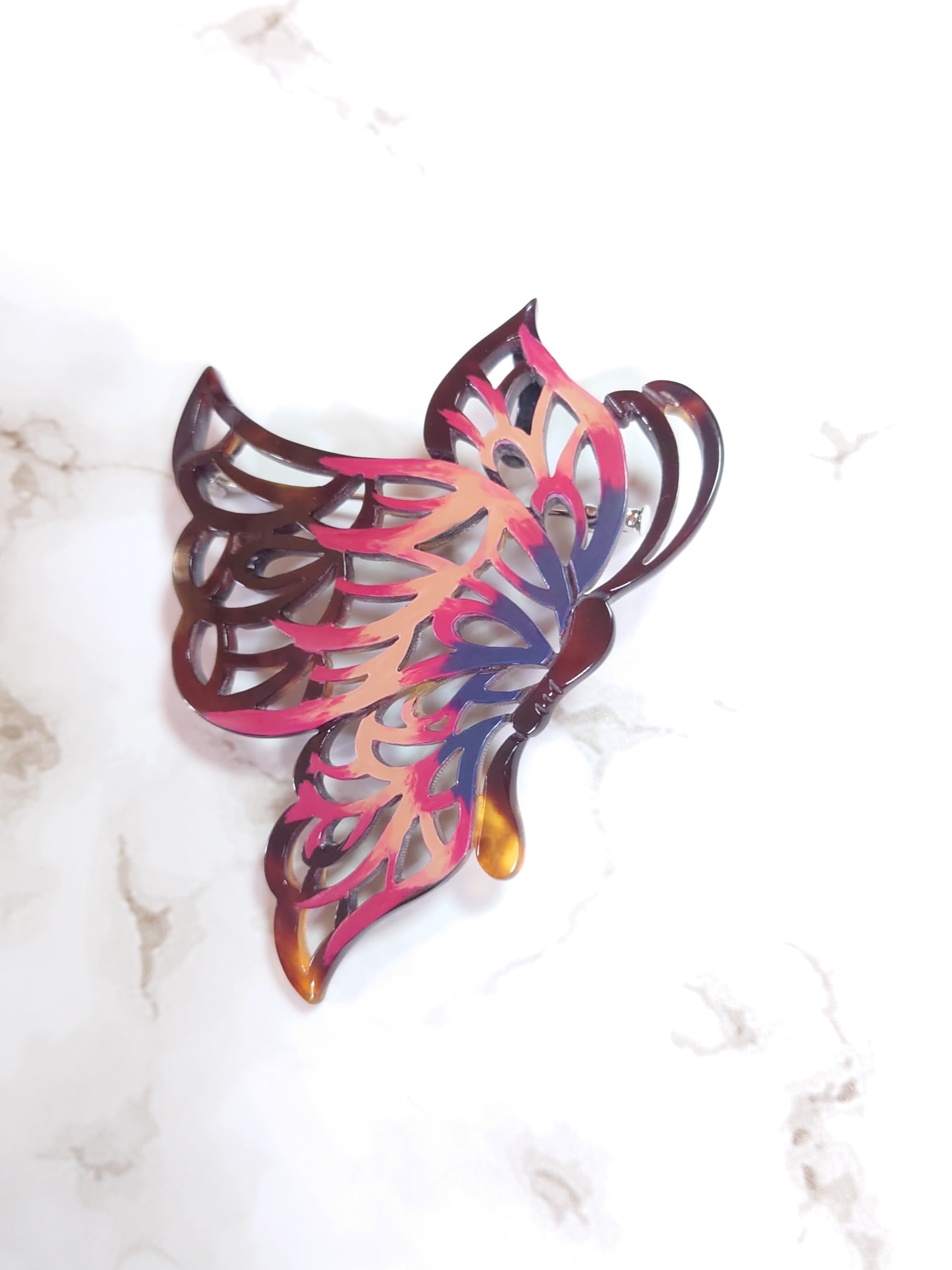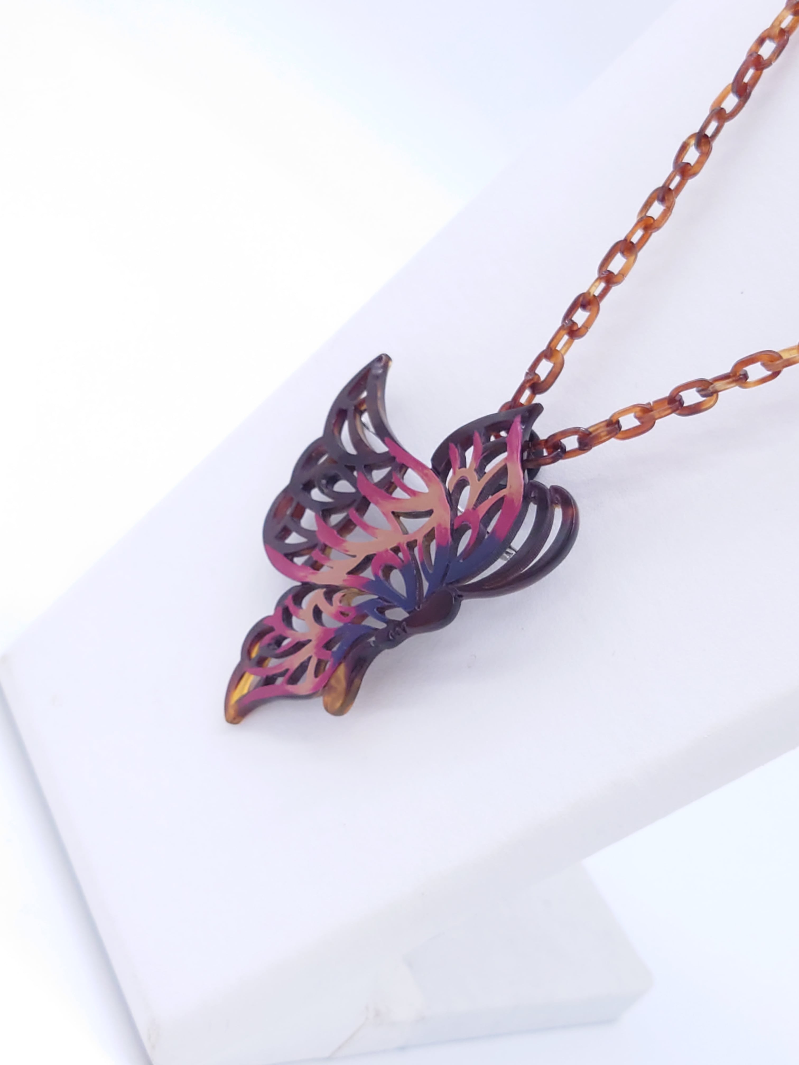 ピンク、ベビーピンク、ブルーを主体としたグラデーションな色合いで蝶々のブローチペンダントを作成しました。ブローチ金具はシルバー素材使用、ペンダント用Cカン付き。べっ甲は蝶々の羽根を細かく透かし彫りし繊細さを出し、そのラインに蒔絵を繊細に施し仕上げました。中心から外側に色の変化を付けモダンに仕上げており蝶々に躍動感をつけています。透かし彫りの数は60箇所以上も透かしており非常に手間暇のかかった作品です。サイズ感は少し大き目なブローチペンダントです。蒔絵は月日が経つと色合いに深みが増してきますので着けているあなたと一緒に成長してくれます。丁寧に時間をかけて作成しましたので是非実際にお手に取ってご覧になってください。別売りのべっ甲チェーンと一緒に着けて頂ければ、より一層素敵なペンダントネックレス、ブローチ兼用に仕上がります。商品はこちらの梱包にて大切に発送致します。天然素材の為、色目やサイズ感は多少異なる場合がございます。※べっ甲及び琥珀等の天然素材はすべて本物です。