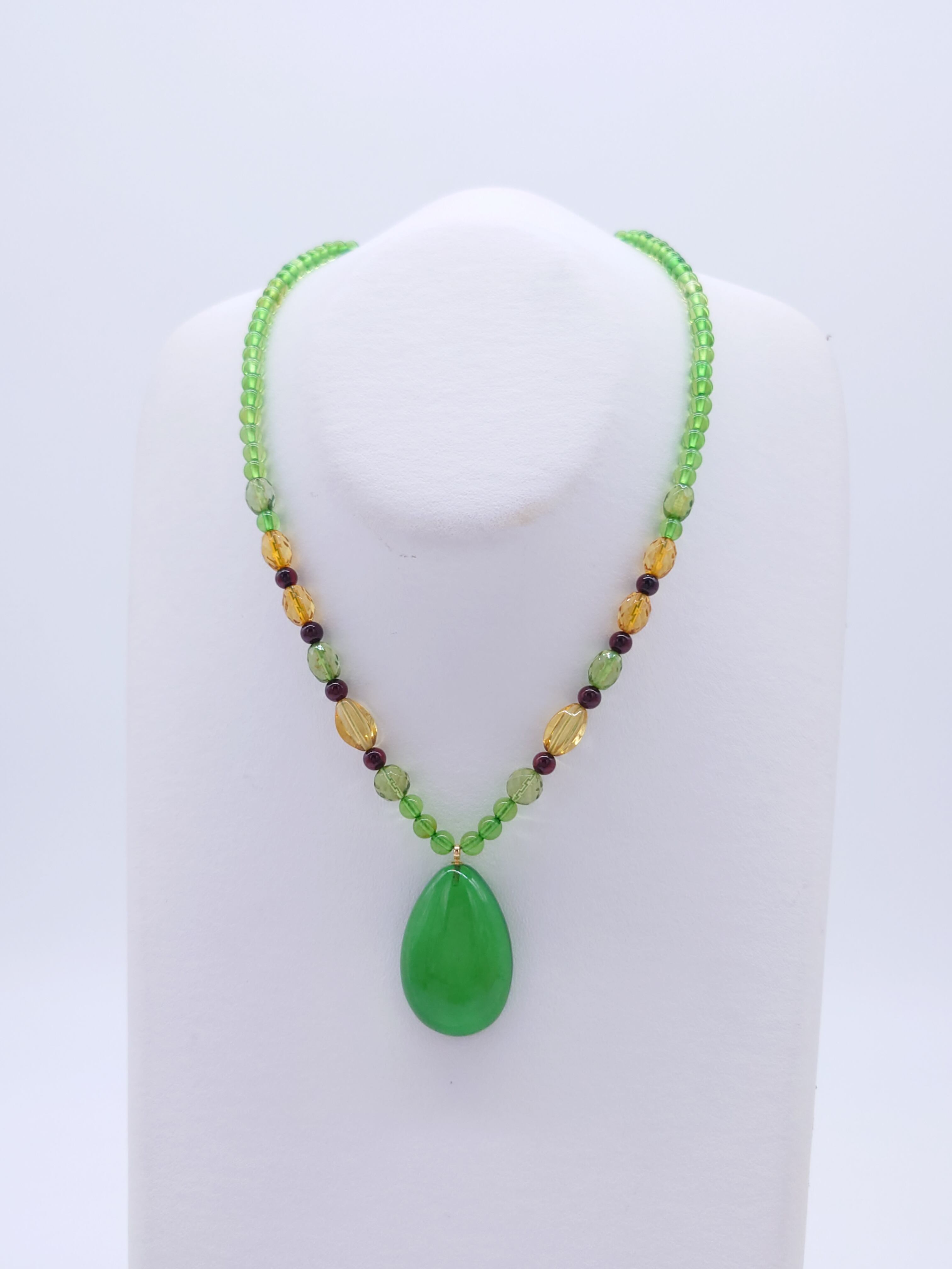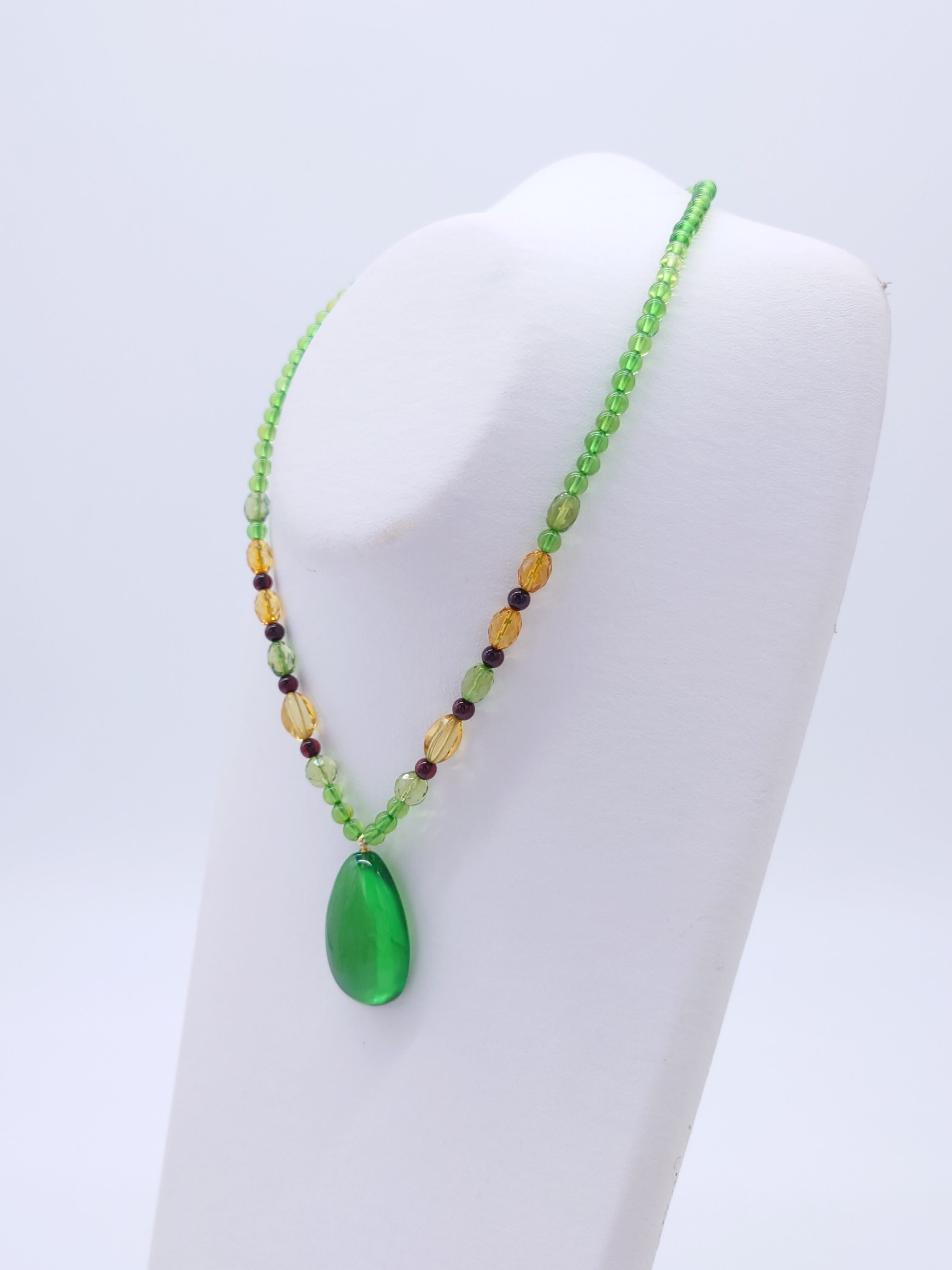 華やかなグリーンのカリビアンネックレスです。綺麗な黄緑色で、コーディネートのアクセントとして活躍。トップには輝かしいカリビアングリーンのドロップがぶら下がり、胸元を美しい女性に魅せてくれます。サイドはイエローアンバー、コニャックアンバーを組み合わせました。カジュアルはもちろんフォーマルシーンでも使っていただけます。年齢も問いませんので親子でシェアされても素敵ですし大切な方へのプレゼントに最適です。オプションでプレゼント包装も致しますので是非ご利用ください。 ※べっ甲及び琥珀等の天然素材はすべて本物です。