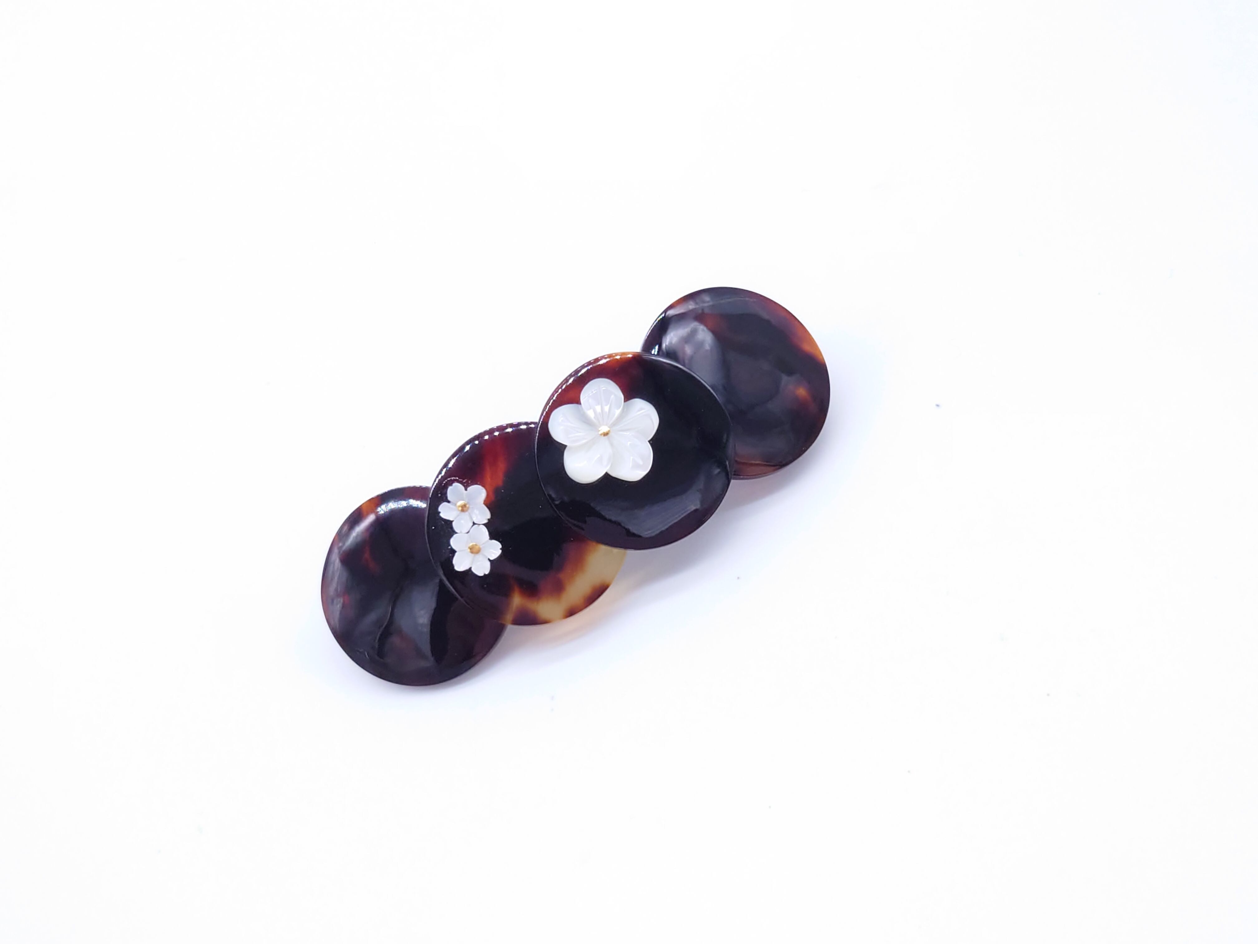 サークル型のべっ甲パーツを4個重ね合わせたデザインの中ぶりな髪留め。蝶貝の花を大小3個添えて可愛く演出!金具はバレッタタイプを使用していますので着けやすくなっております。べっ甲はとても軽いためズレ落ちがしにくく疲れません。自分へのご褒美にいかがでしょうか?商品はこちらの梱包にて大切に発送致します。天然素材の為、色目やサイズ感は多少異なる場合がございます。※べっ甲及び琥珀等の天然素材はすべて本物です。