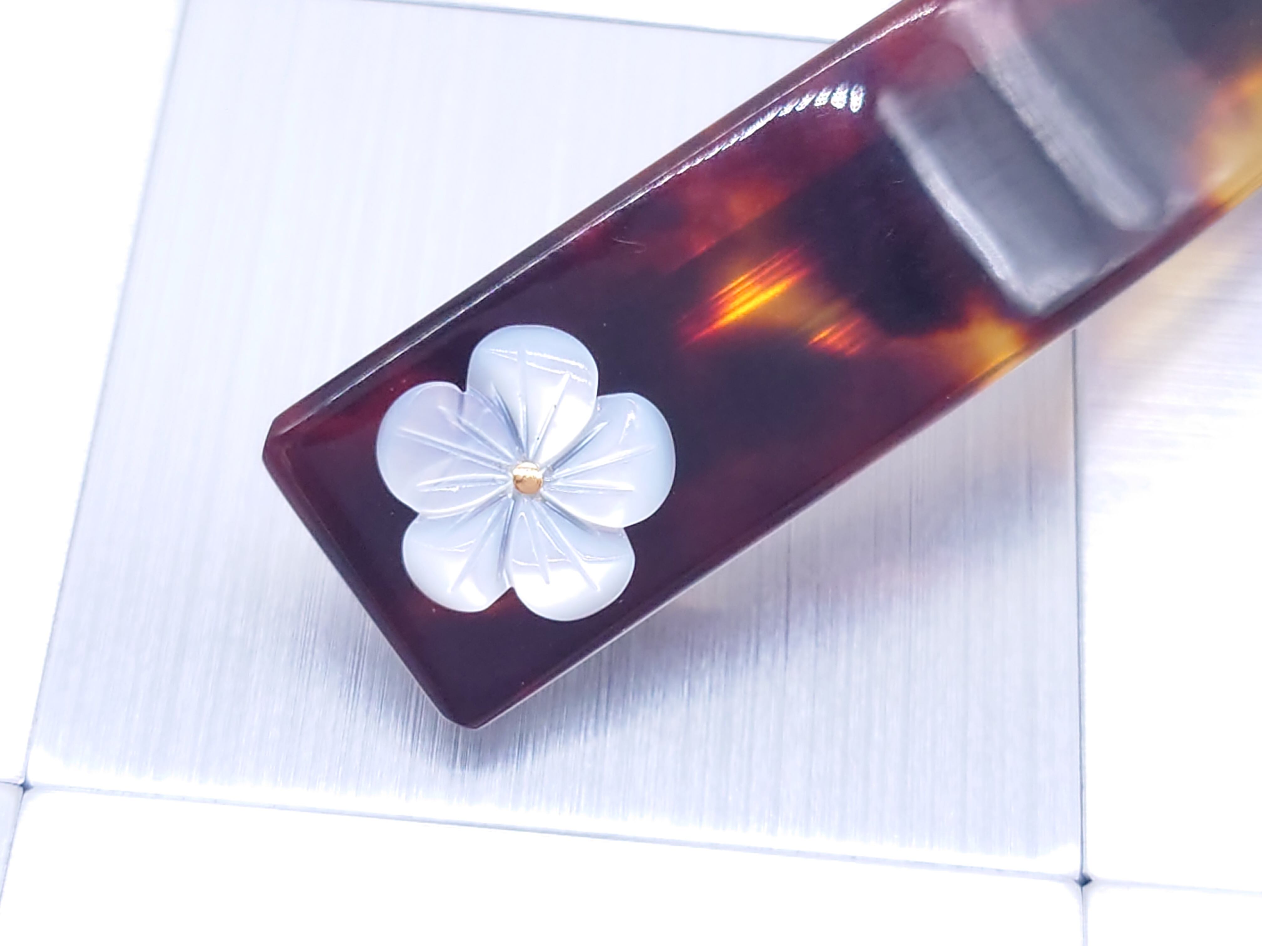 ●サイズ タテ約1.8cm×ヨコ約8.8cm ●説明 本べっ甲 バラフ(背甲)使用 蝶貝(花)使用 シンプルなバラフの中ぶり髪留めに白く綺麗な蝶貝花を付けました。丁寧に作りこまれたお洒落で大人カワイイ一品です。長方形の横長デザインでシャープな印象。蝶貝花の中心には金メッキのビスで鼈甲にしっかりと取り付けています。それなりの大きさがあり存在感もあります。カジュアル中心にフォーマルどちらにもご使用ください。大切な方へのプレゼントにも最適です。金具はバレッタタイプを使用していますので着けやすくなっております。べっ甲はとても軽いためズレ落ちがしにくく疲れません。自分へのご褒美にもいかがでしょうか?商品はこちらの梱包にて大切に発送致します。天然素材の為、色目やサイズ感は多少異なる場合がございます。※べっ甲及び琥珀等の天然素材はすべて本物です。