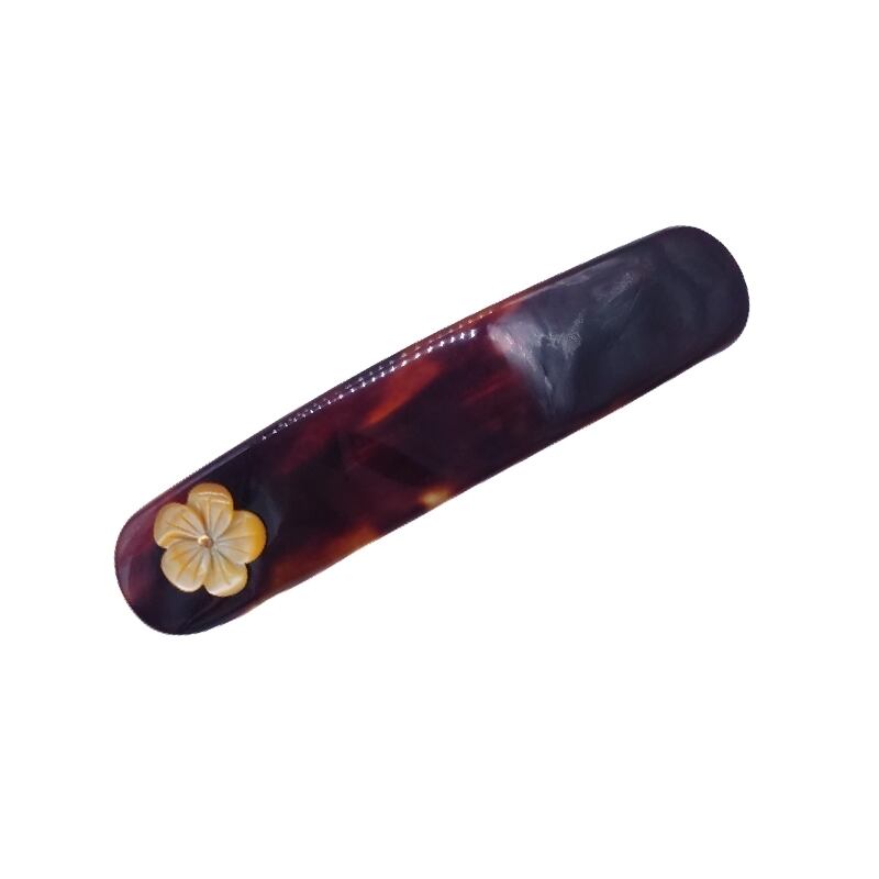 オーガニックな素材の蝶貝花をべっ甲、長小判形の端に可愛く取り付けた髪留めです。シンプルなデザインのバラフにアクセントとして花を取り付けたデザインは飽きがこず長くご使用いただけます。べっ甲と蝶貝の美しい色合いをお楽しみください。カジュアル、フォーマルどちらにも合わせやすく貴女の装いに華を添えて頂けます。しっかりと割と肉厚に作成しているため安心してご使用いただけます。金具はバレッタタイプを使用していますので着けやすくなっております。べっ甲はとても軽いためズレ落ちがしにくく疲れません。自分へのご褒美にいかがでしょうか?商品はこちらの梱包にて大切に発送致します。天然素材の為、色目やサイズ感は多少異なる場合がございます。※べっ甲及び琥珀等の天然素材はすべて本物です。通常希望小売価格¥20,000
