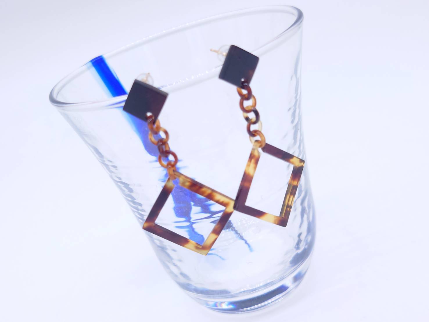 部スクエア型べっ甲パーツに直結金具を取り付け、丸カン5個でぶら下がりタイプにして、下にはスクエアパーツを取り付けました。お顔周りでプラプラと揺れとても大人可愛いピアスに仕上げました。丸カンのチェーンタイプがお洒落に演出しています!カジュアル、フォーマルのどちらにも良く似合います。べっ甲はとても軽いため耳への負担も軽く着けていることを忘れるくらいですのでお手軽にご使用いただけます。18金使用の為アレルギーの方にも安心してご使用いただけます。本物の良さを味わってください。大切な方へのプレゼントにも最適です。商品はこちらの梱包にて大切に発送致します。天然素材の為、色目やサイズ感は多少異なる場合がございます。※べっ甲及び琥珀等の天然素材はすべて本物です。通常希望小売価格¥22,000