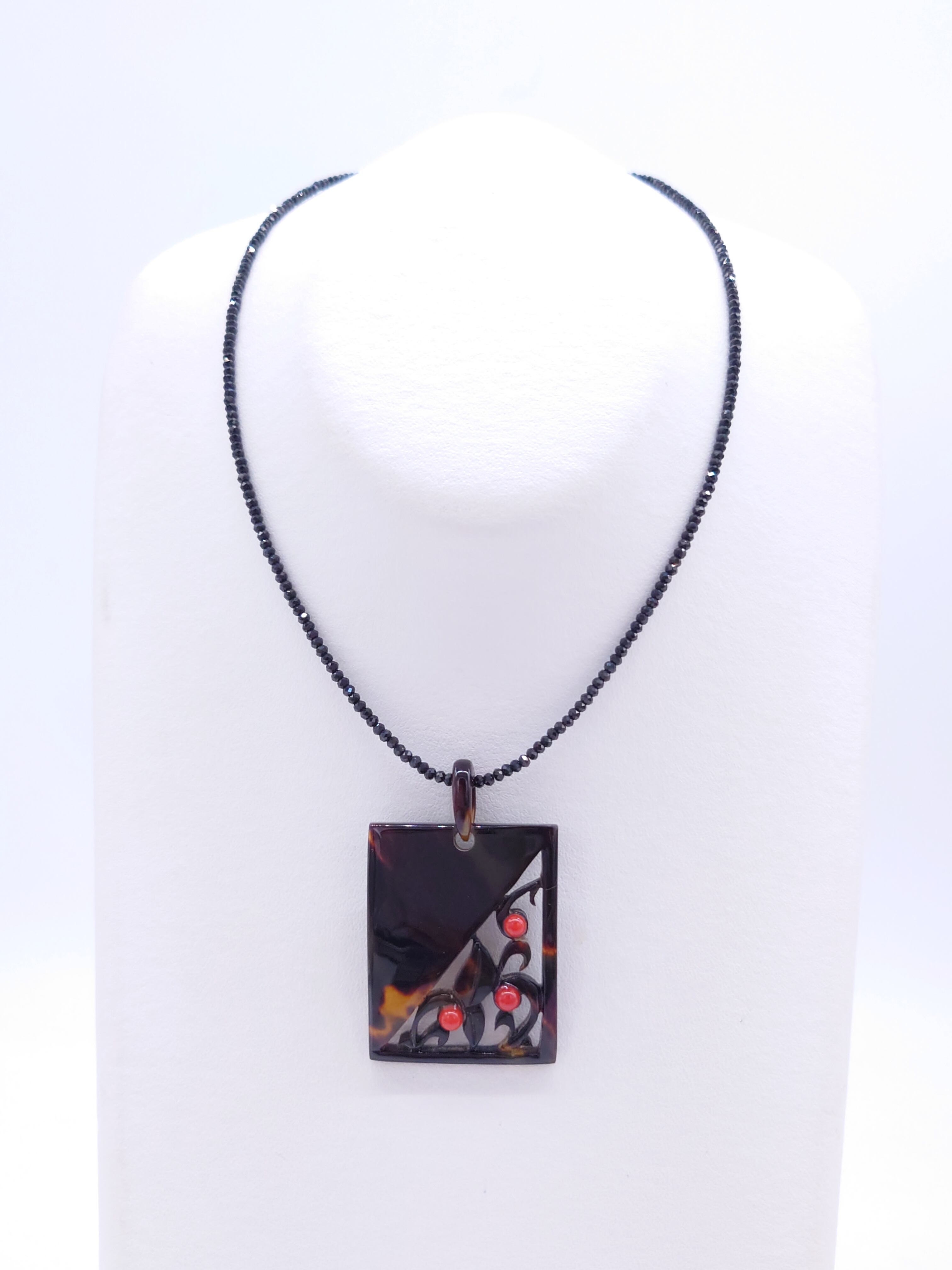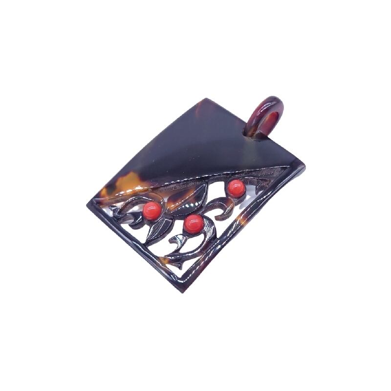 バラフのスクエア土台に透かし彫りやスジ彫りを駆使して作られた熟練の職人の技術が光る一品。リーフと唐草を組み合わせたデザインは上品で大人可愛いアイテムです。希少な珊瑚も3玉使い贅沢に作成。伝統工芸品をカジュアルにTシャツなどでコーディネートして頂きたいです。貴方だけのオーガニックアイテムを手にしてください。別売りのスピネルチェーンやべっ甲のチェーンを合わせてもらえると一層豪華で上品に仕上がります。お友達とのご旅行などにも活躍すること間違いなし!是非、自分へのご褒美にもお買い求めください。商品はこちらの梱包にて大切に発送致します。天然素材の為、色目やサイズ感は多少異なる場合がございます。※べっ甲及び琥珀等の天然素材はすべて本物です。通常希望小売価格¥22,000