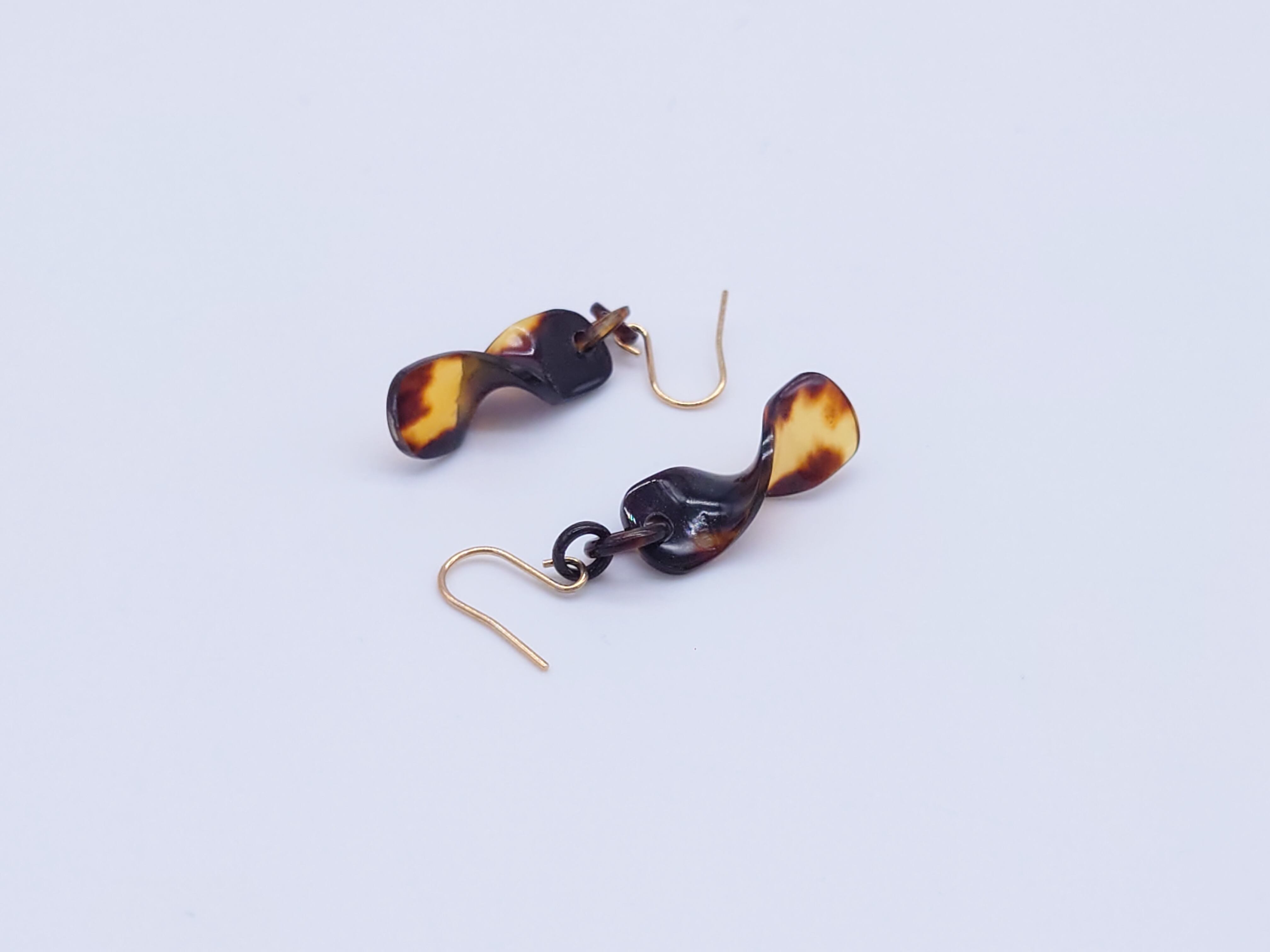 美しいバラフ柄のべっ甲パーツにヒネリを加えて動きを出したピアスは耳元でプラプラと揺れるたびに美しい艶感が味わえます。シンプルで飽きがこず末永くご使用いただけます。シックで大人な装いにも華を添えてくれるアイテム。またカジュアルにも良く似合いちょっとしたお出かけにもご一緒して欲しい一品です。親子でシェアされても素敵!現品限りでリーズナブルなお値段で提供中!金メッキされていますがチタン製のニッケルフリーのためアレルギーの方にも安心してご使用頂けます。べっ甲、琥珀はとても軽いため耳への負担も軽く着けていることを忘れるくらいですのでお手軽にご使用いただけます。本物の良さを味わってください。大切な方へのプレゼントにも最適です。商品はこちらの梱包にて大切に発送致します。天然素材の為、色目やサイズ感は多少異なる場合がございます。※べっ甲及び琥珀等の天然素材はすべて本物です。通常希望小売価格¥8,500
